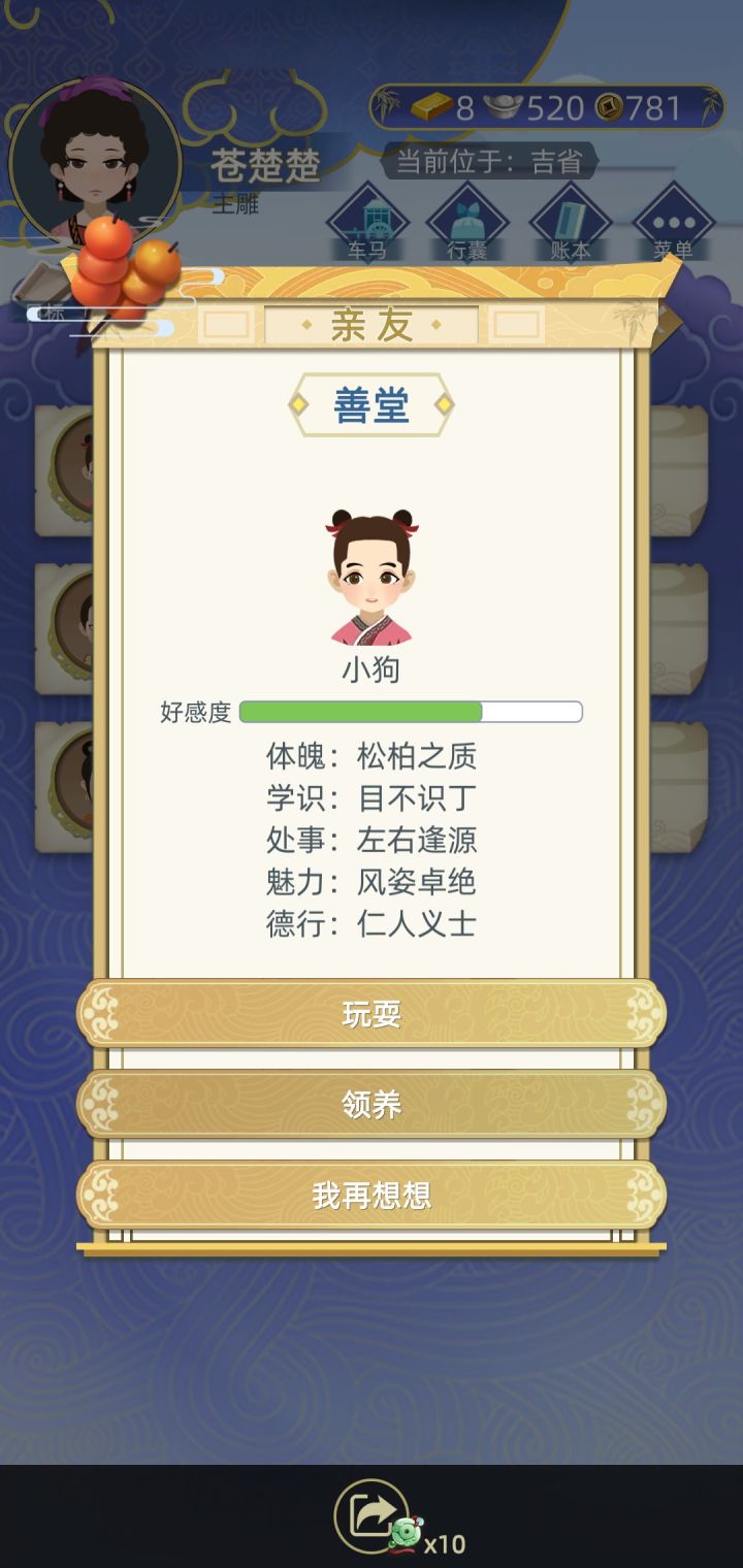 我想领养,但是嬷嬷说我孤身一人,就不给我领养???大哥,我要是有夫婿怎么会没子嗣?我建议,要么女线开放媒人选项,要么取消这一限制,讲真父母双亡,那劳什子族长也就来那么一两次,我想结又结不了,还不给领养,这不还是断子绝孙吗