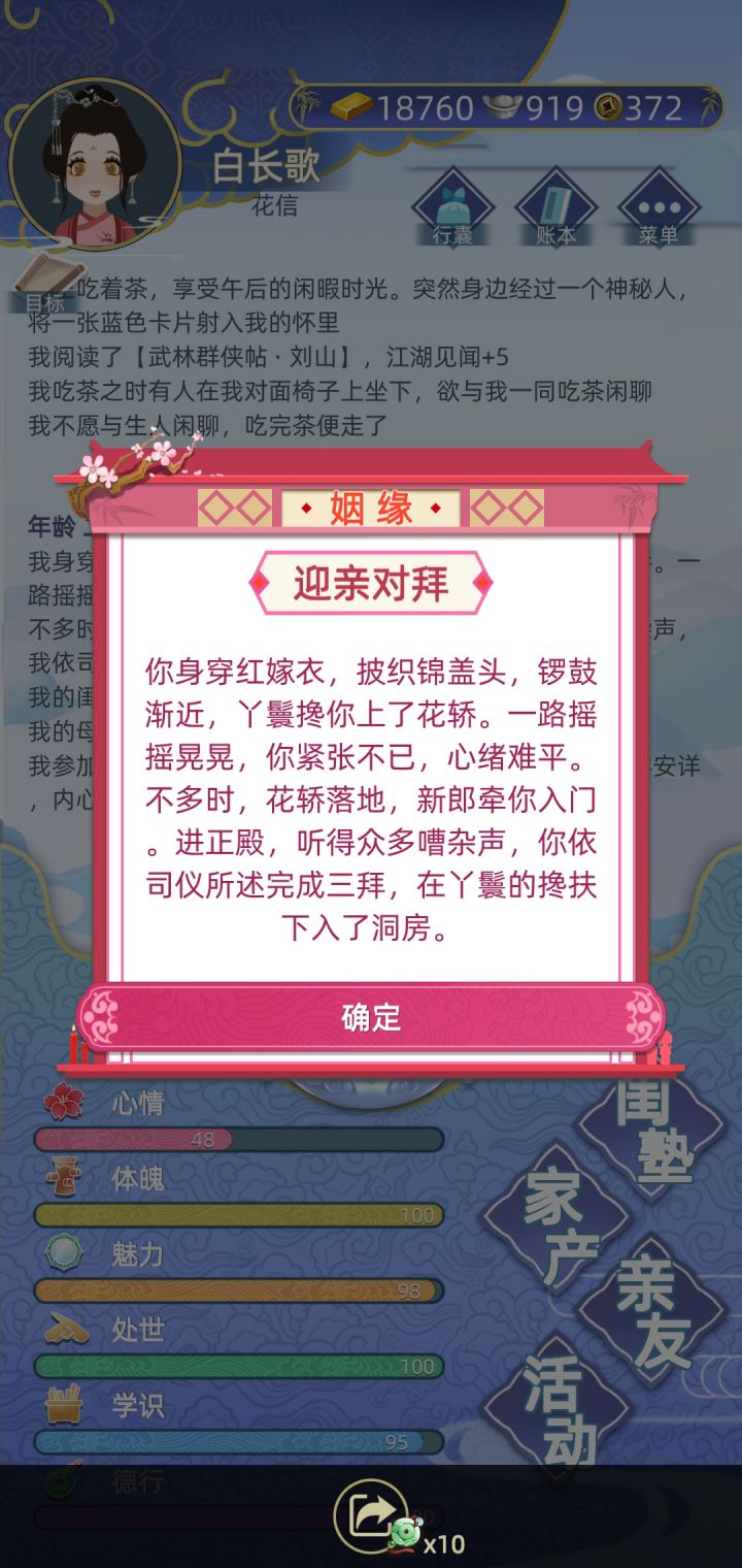 本来很期待女线的,但是玩了一上午觉得真的有点无聊了。首先,男线想读书就读书,女线我想当医官结果家里太穷不让去?很多时候都没同意,好不容易看见一个孙女进了医馆学习,我就去玩了,结果没考上,没考上就算了,配药和熬药我也是云里雾里,还有就是不知道怎么升职,还不如做妆娘做殓师呢。其次,女线如果父母没张罗就要一直等,等到最后都没人娶我,有次得了个未婚夫,我卖房子被关了,出来他还是我未婚夫,就是不娶我,解