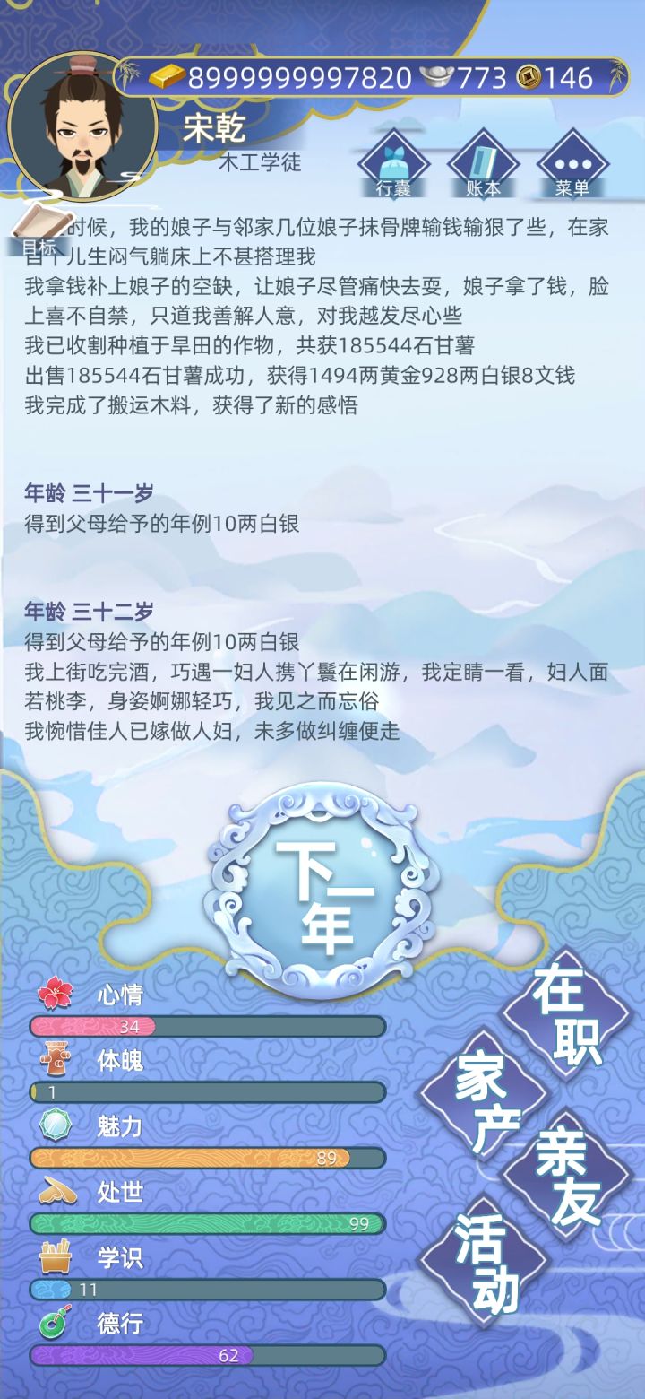 作为一个非洲人,玩这游戏是真的很艰难,三次辛辛苦苦攒下了万贯家财,最后没有继承人导致重新来过。难道房子不够大吗?每年给你们的年例不够多吗?没有尽自己最大的可能培养你们吗?一个个不争气,二十几三十几了没工作,不结婚,不生孩子。没工作没关系,我可以养,不结婚没关系,我可以催,但是不生孩子,没法催。当继承孩子的人生的时候,想着最后努力一把,拜菩萨,去客栈,纳妾,都没法生,我甚至把原配休了,重新找个年轻的