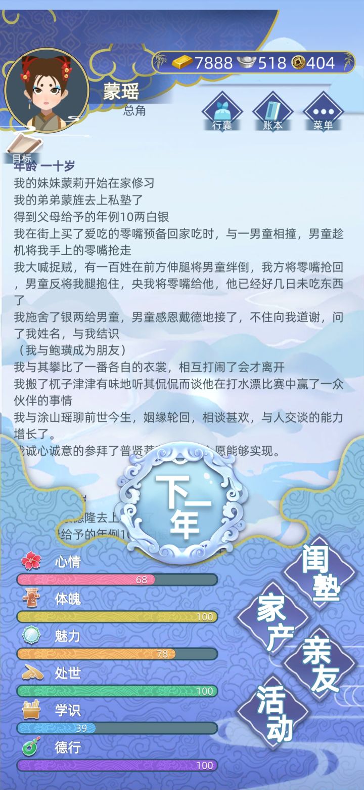 能不能多加一些加心情的方法啊!到后面亲属一个接一个的西去,我又不愿去喝酒,每次只能靠着去医馆还有和老鼠聊天回心情,还回不过来