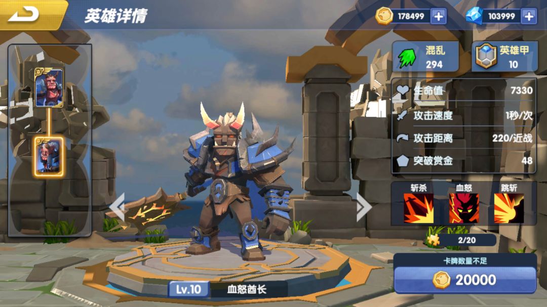 酋长(混乱攻击—英雄甲)斩杀:当前敌方目标生命值低于20%(斩杀血线)时,直接将其击杀,冷却时间8秒血怒:每击杀1个敌方单位,增加1层血怒层数,每层血怒会将斩杀线提高2%(初始为20%,上限至30%),血怒效果持续五秒,血怒状态下击杀敌方单位将刷新血怒时间跳斩:每击杀1个敌方单位,跳跃向生命值百分比最低的敌方单位,直接造成该单位20%生命值的攻击,并额外造成血怒层数*2%的生命值伤害血怒酋