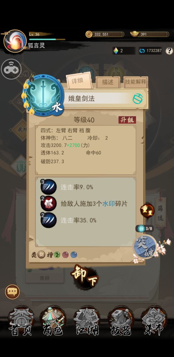 百灵御个人加点技能攻略百灵御做为一个中期的职业目前来说命中有点不尽人意内功 天地经 加强水火金三印武艺 无极剑 女英剑 娥皇剑 夫诸 肥遗 小周天大周天 催功 挪穴 移脉(其他随意)思路 腿法加速度 水火印 剑法连击 水火印 大招无极剑炸印会有拆招buff火印 炸印给造成伤害 水印 炸印造成减速 核心 满星催功 刚好能放下技能 不会出现万恶的小拳拳 自己加速连击 对方减速 再加上无极 女英伤害也是不低的 可玩性还是很高