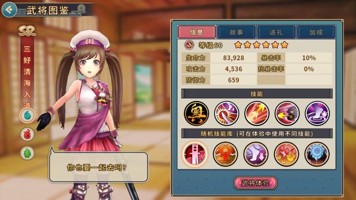 面临再次更新时,又回想起2月12日下午更新的4名新武将,也希望被了解被认同。有萝莉,有御姐,可爱、性感还傲娇?不管爱或不爱,她们都在那里~不离不弃SR森兰丸(斩系)被动:施放技能有30%几率使敌人受到的伤害提升30%,持续5秒1技能:回旋刀,倍攻来回两段伤害,施展速度一般,丢出去还得等刀回来2技能:巡狂风暴,也是倍攻5次刀刃围着自身转,关键是施展时自身不能动,范围不大也很容易挨打1辅助: