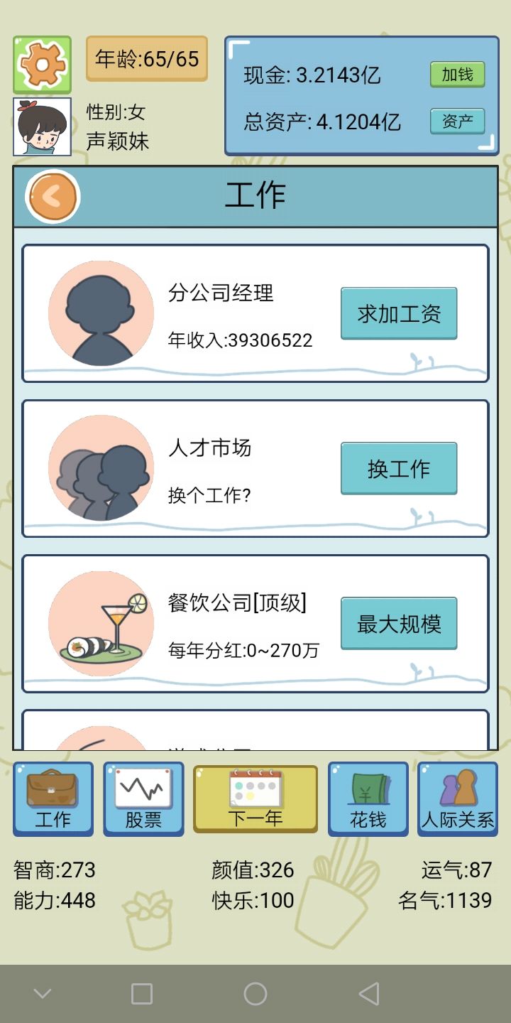一百亿的资产是如何打出来的?以下为总结要点1 切记不要沉迷股票,这个游戏的股票没有玄学,两条结论:第一:股票两轮不出售就会一直跌。第二:房地产股票一直跌。(由于游戏版本更新,似乎出现了变数,上述为老版本股票。)2 上大学去提高综合数值,毕业后会匹配高工资的工作至少20万以上,工资和数值成正比。3 可以一边上学一边打工,然后找合伙人,要找运动员。刷满好感度后能力一百五十以上可以合
