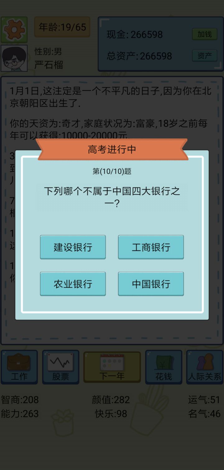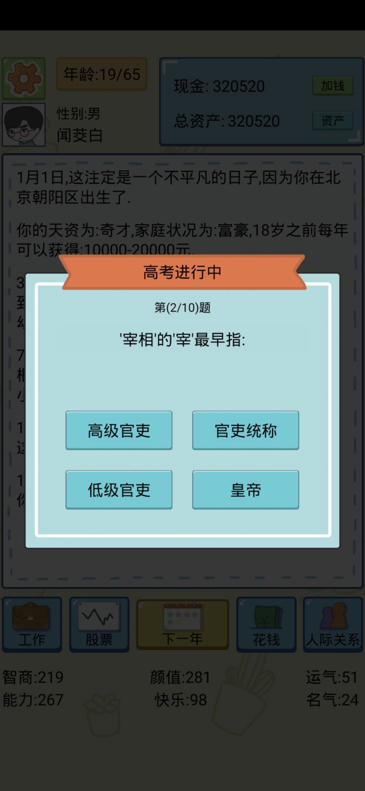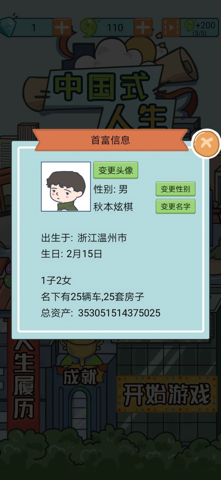 我个人觉得在这款游戏当中,可以在自己的儿女那方面添加上自己对于子女的培养方案,比如,列出一些大学让玩家为儿女选择等…还有在好友那方便那些好友可以是随机出现不要每一局都一样,并且可以再添加一些好友人物,希望下一个版本可以接纳我的意见