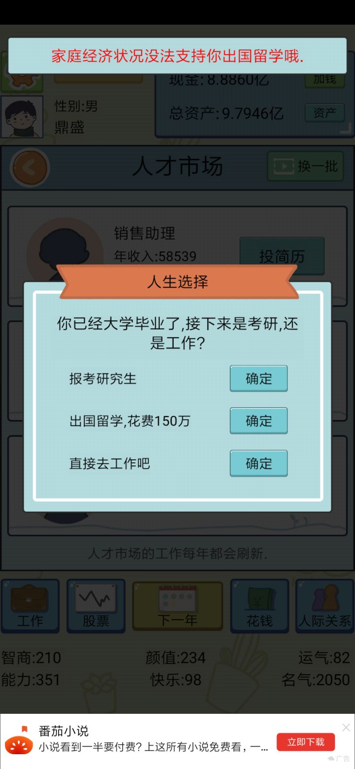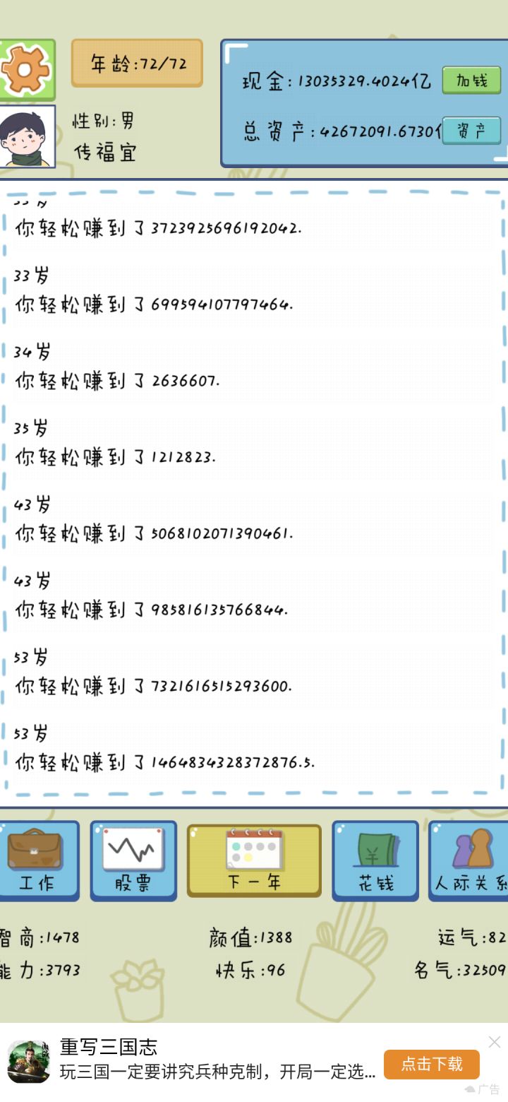 挺好玩的,就是第一代没钱,往后的几代越来越有钱。但奇怪的是明明有钱自己就是不能出国留学。是bug吗?还是因为要在国内赚钱啊。再就是广告真的很烦òᆺó,而且还自己画一个叉叉,真的很阴毒