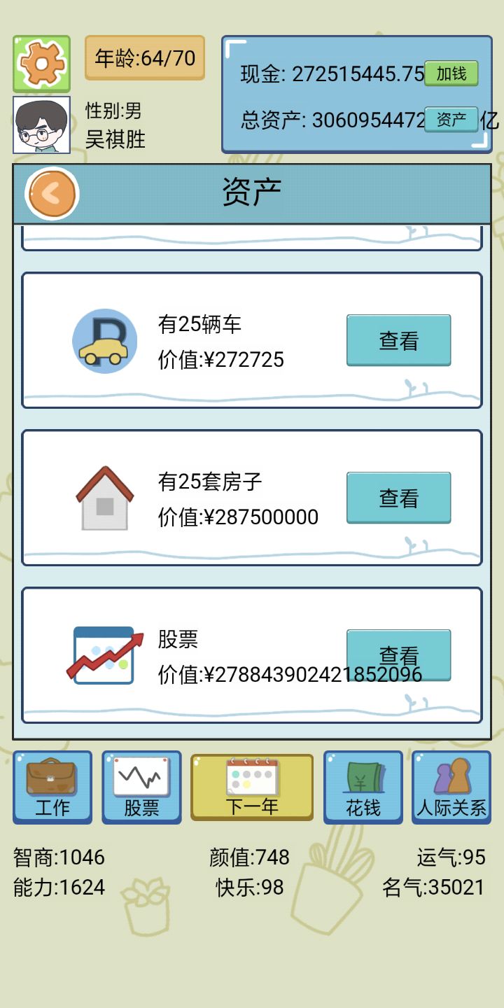 我也是醉醉的加多点剧情,广告少点,这游戏还可以,我短短,2个小时就已经比马云全宇宙最富有的人了