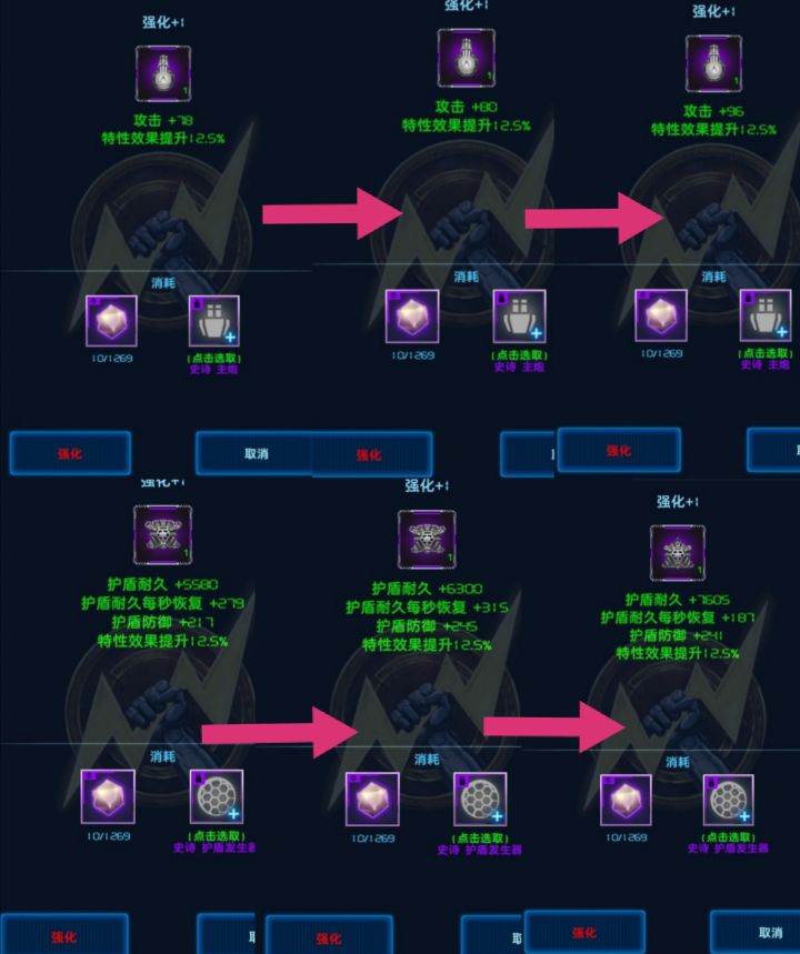 装备强化主要材料为:白,绿,蓝,紫,橙装备品质越高需要的材料也就越珍贵装备中的隐藏等级,决定了一个装备的强弱,如图↓装备隐藏属性越高,提供的属性越多并且装备强化也会增加百分比的面板效果白色强化每次+5%(同品质类型装备)〖强化上限5〗绿色强化每次+7.5%(同品质类型装备)〖强化上限5〗蓝色强化每次+10%(同品质类型装备)〖强化上限10〗紫色强化每次+12.5%(同品质类型装备)