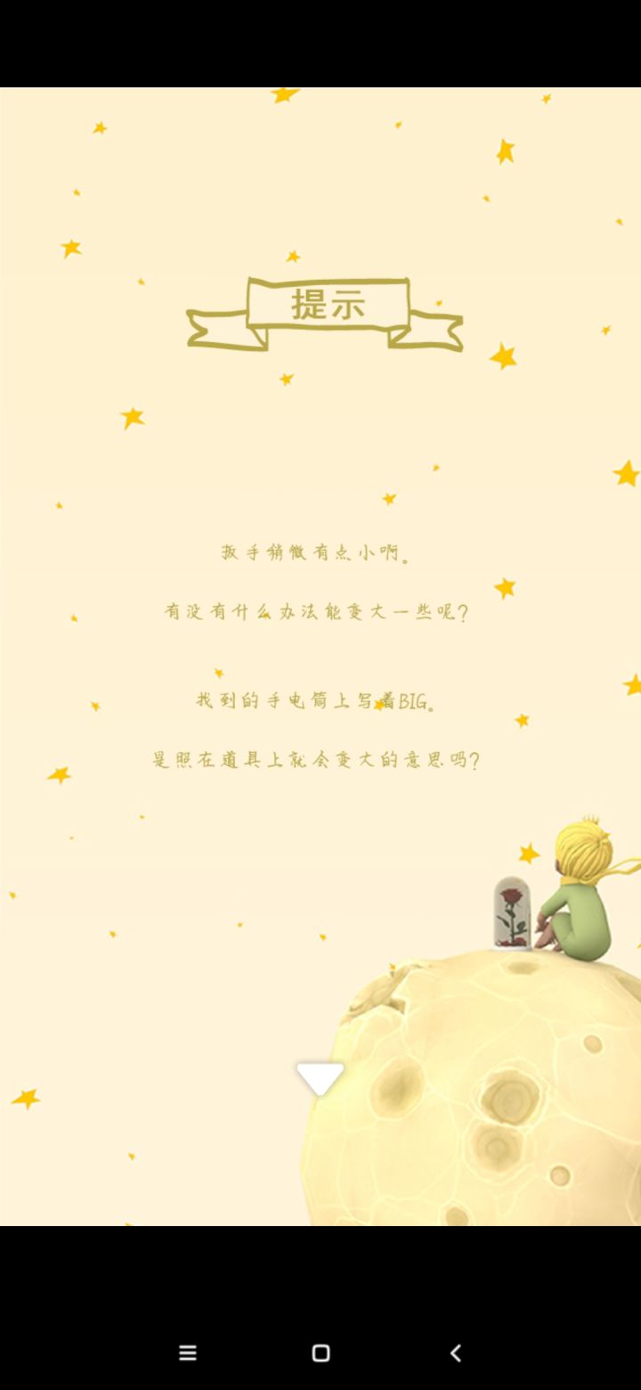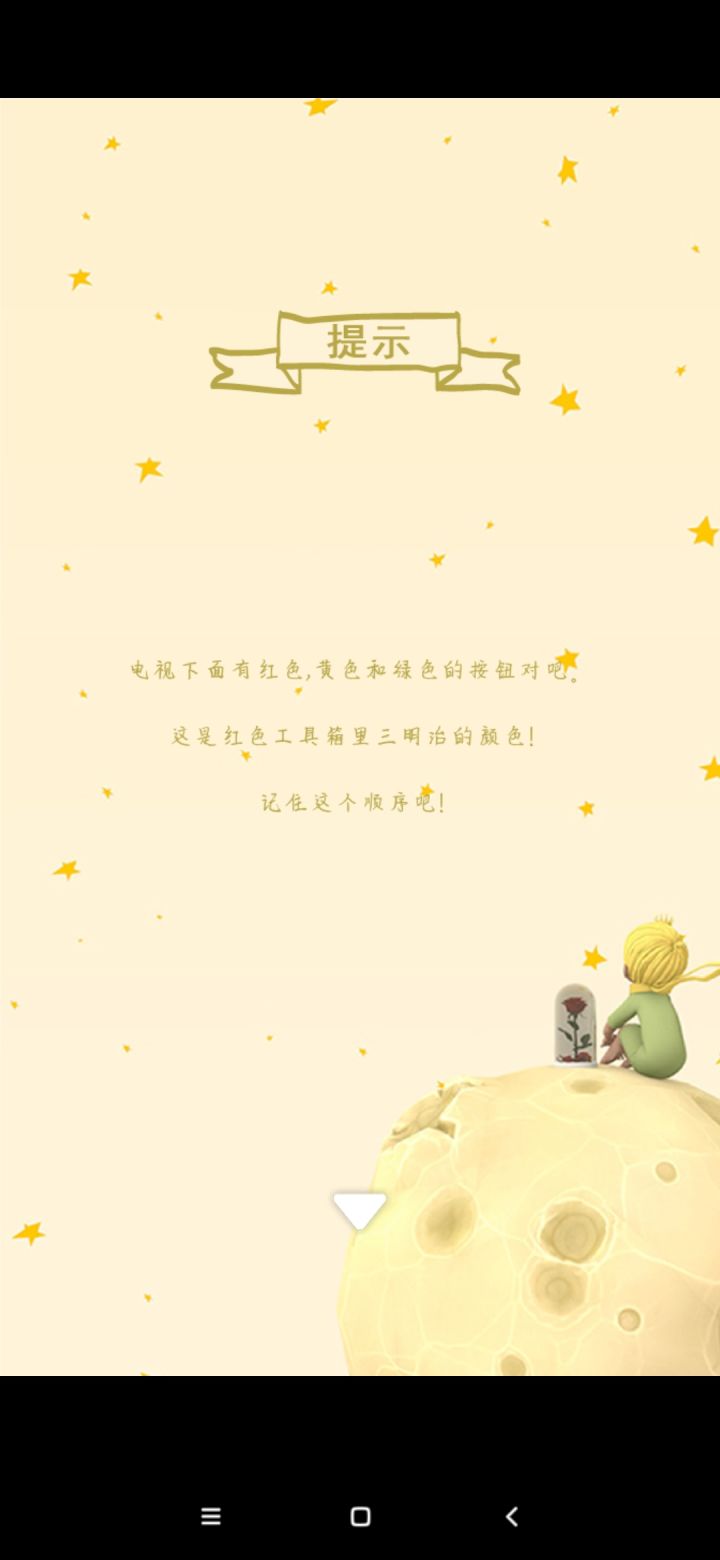 第一关:救活小王子的玫瑰1. 转到树的房间,点墙边的机关,密码见画板↑→↓↗,点大象拿油漆2. 点保险箱,密码见房间散落的红绿蓝纸,开保险箱,拿刷子。按箱子内侧星球开柜子(见下),拿铲子● ●● ●● ●按书的排布打开钟的机关,拿电池。按保险箱里面星星的画法依次点击钟下方的机关(星星的顶点),拿萝卜,萝卜换兔子小姐的电池。3. 国王房间,柜子一层密码为各色气球(★)的个数为153