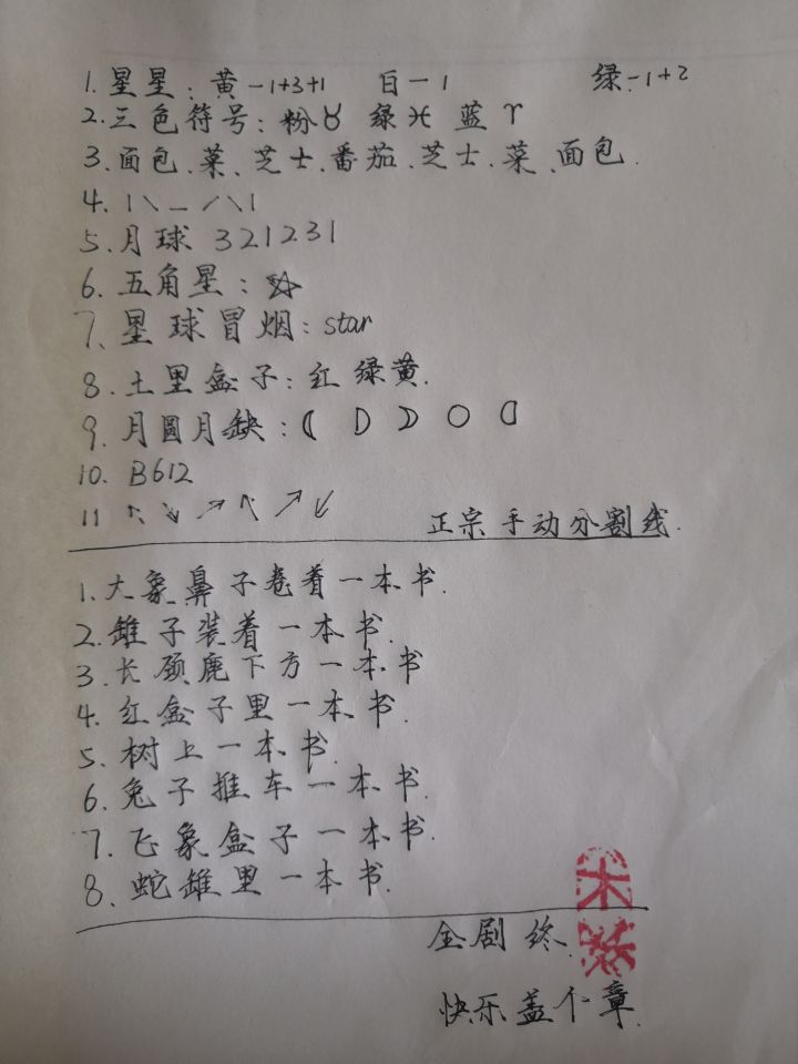 1.点击大象🐘,书+12.羊的房间,电视柜中得针、锤子🔨用锤子敲碎玻璃花瓶,书+23.用针扎破狐狸的气球,得到钥匙🔑打开红箱子,书+34.根据画板上的图案,打开大树房间电视柜第二层↑→↓↗,获得剪刀;第三层获得铲子5.羊的房间剪下斧子点击水井三下(河神沉下时点),得红色斧子6.①砍树,书+4,②挖土得萝卜,把萝卜给兔子,书+57.①大钟上指针的颜色和位置,得红4,绿1,蓝8大