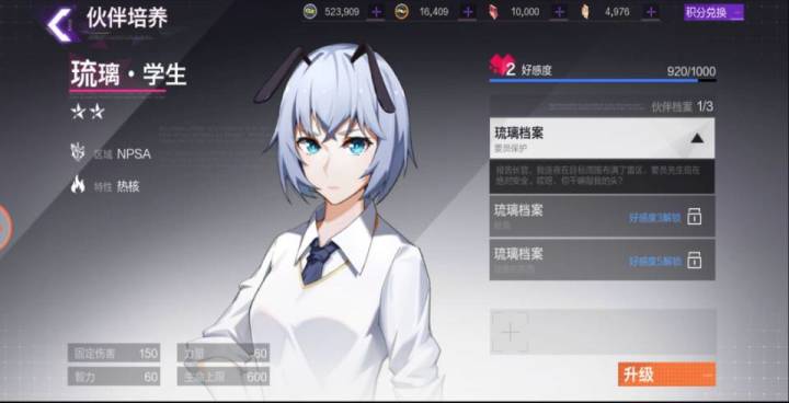 身上大部分的好感礼物都是琉璃的,所以一些没写XX喜欢吃的也一起给了她,好感度快3级了,现在解锁的2级档案文案有点逗哦。前面还一本正经的,突然画风360度无死角转变,太搞笑了。琉璃是要走喜感路线了?(不对,重点错了,重点是谁敲了我琉璃的头!出来挨打!这么可爱的妹子,怎么下得去手,敲坏了可怎么办!)