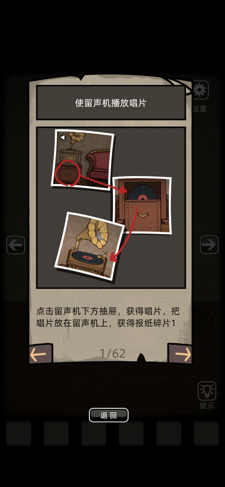 1.小孩床的房间,上面星星月亮按等式排好,54×3=162;地毯右边有一个镜子碎片2.镜子场景,第一个抽屉密码543162,拿到剪刀、砝码1;抽屉上拿到画笔3.床上的布娃娃,用剪刀剪开,获得日记纸24.镜子场景,将镜子碎片补好,获得符号线索5.木马场景,右边箱子打开,获得音乐盒公仔6.镜子场景,用画笔画中间物品,玩填格子游戏,得到音符55345537.钢琴场景,拿到钢琴上的砝码28.