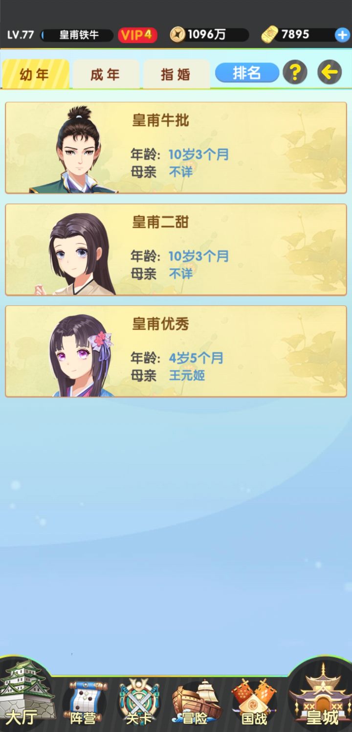 玩了第三天,还没搞懂些什么,净在国战挨打了(然后自己把学弟骗进来打了学弟一顿)本人皇甫铁牛,下面四位是我的孩子们,他们的名字是我对皇甫家族寄予的厚望(可能)!哦对了,这个游戏在我这叫皇甫家族的明天欢迎大佬来指导我怎么玩这个游戏