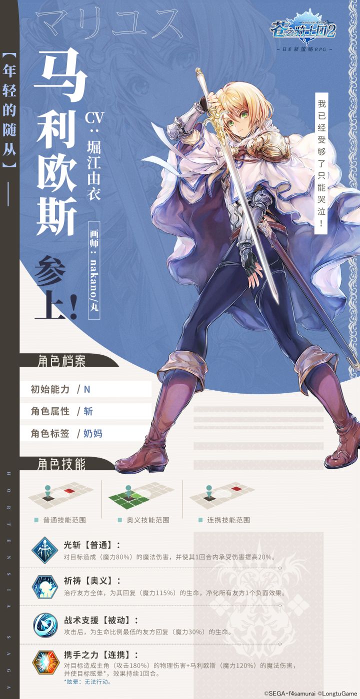“我的名字是马利欧斯·卡斯特雷德,目前正作为随从为欧贝鲁的领主效力。你说梦想?当然是成为骑士了。我不需要什么地位,只想获得力量。能够拯救一个人的力量......啊、不,没什么,不小心说了多余的话......”—— 马利欧斯档案解禁 ——角色攻略:同时上阵男主+马利欧斯,可以激活当前游戏内独一无二的连携技,造成爆炸伤害与控制效果,在保证同队角色血量健康的情况下,可以消耗奥义点数触发此技能。