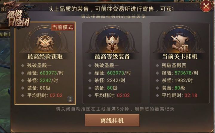 【超燃冒险团】是一款暗黑风挂机手游,大型的西方魔幻类型手游,打造最强的3D感,作为一款不肝的挂机手游,那就来好好讲解一下咱们的挂机功能吧。离线挂机:【超燃冒险团】主打就是不肝不氪,离线挂机是游戏内资源产出的重要渠道之一,在页面的正下侧有离线挂机按钮,点开后就会发现,可以选择经验优先、装备优先等方式,系统会帮你算好挂哪个地图对你来说收益最大,所有信息一目了然。轻松挂机,睡一觉起来又是连升几级加满