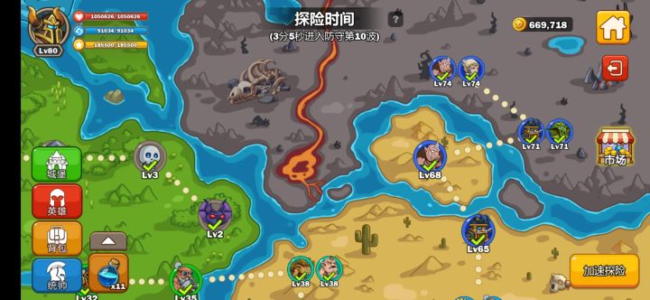 主2技能,70级之前用攻击和生命石,可以在1技能持续时间内使用2技能实现极限越级过关卡,70之后石头改为2攻2溅射或者随便其中一个换速度石,装备有什么用什么,优先存钱升商店,商店点到4级再刷刷装备和石头,比较顺的话10波前就80了,不太顺也是11波之前就轻松满级