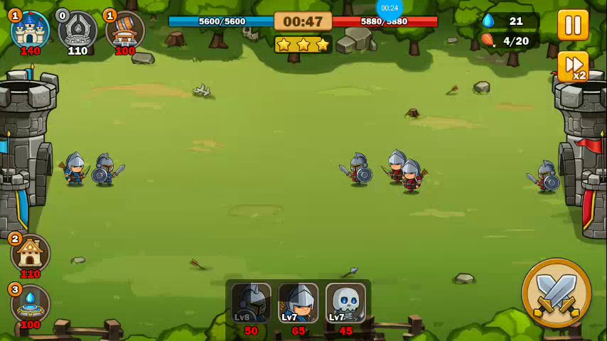 要拿三星通关,最主要的还是三张白卡。比如现在我的白卡都是7级。今天的竞技场刷得是2。16关对面只有盾跟射手7级,骷髅没有7级。就可以三星通关。我的打法如下:开局资源升3级。盾弓互点,升20人口,骷髅弓互点,升30人口,盾弓互点。兵满立刻进攻。有空人口就狂点盾骷髅。让前排不间断补充。保证8个弓不被打到。三星基本可以。同级三星基本不是难事,但越级三星就是很难的了。现在我白卡7级。打主线关,对面哪怕