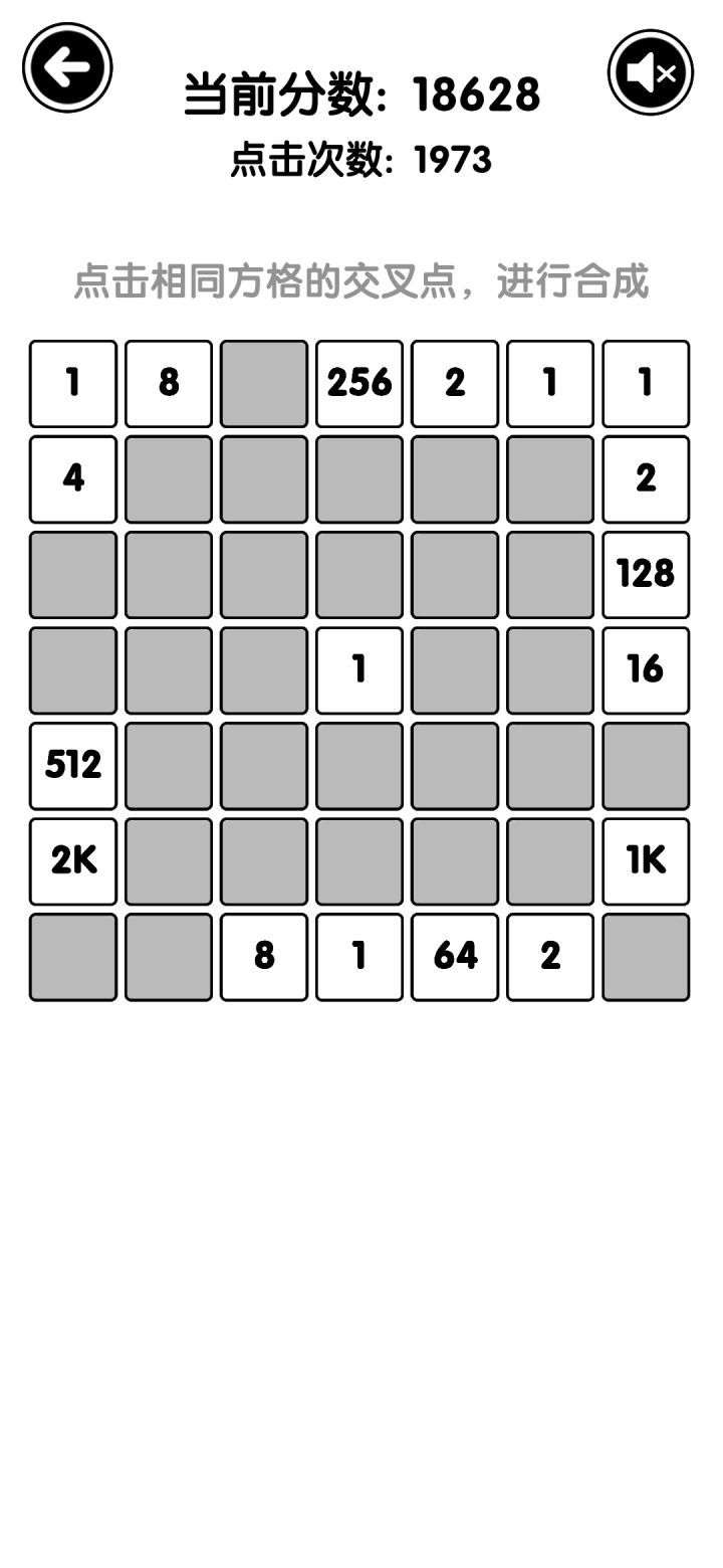 已知规则1.点击相同方块的交叉点即可合并。两个相同方块有两个交叉点,同一直线上除外。同一直线上的两个相同方块有一个到五个交叉点。2.三个相同方块合并后得到的方块是原方块的两倍,例:三个2合并得到4。四个相同方块合并后得到的方块是原方块的四倍,例:四个8合并得到32。两组相同方块同时合并后得到的方块是较大的原方块的两倍,例:两个2和两个4同时合并得到8。3.两个相同方块合并得到的分数是其中一个