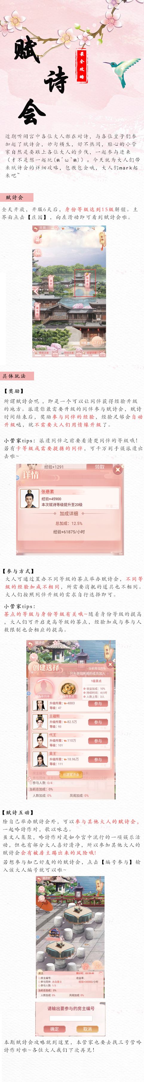 各位大人好啊,这里是小梦。我们的游戏已于2月27日早10点正式开启第一次不付费删档测试,具体测试时间为2020年2月27日10:00-2020年3月4日23:59,欢迎各位大人前去体验。今天小梦为大人们带来了一篇【赋诗会】玩法攻略,在赋诗会中不仅可以跟其他玩家一起吟诗作对,还有可能攻略皇子哦!具体内容见下方:关注游戏官方微信公众号【大唐烟雨梦】和官方微博【大唐烟雨梦之娘娘快跑】均可获得游戏礼