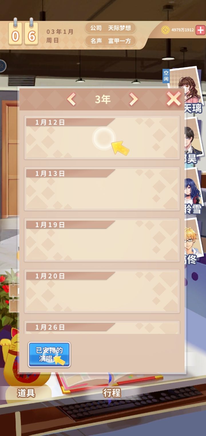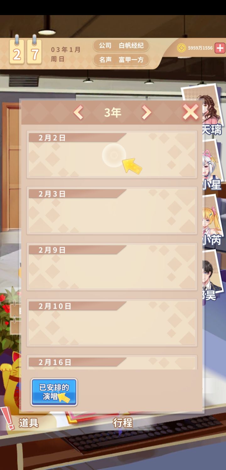 能不能把时间优化一下?一点都不稳定,有时候星期一马上就到星期天了,而且那个演唱会又用不了他那个教程,还消不掉,还有体力啊什么的,反正bug有点多