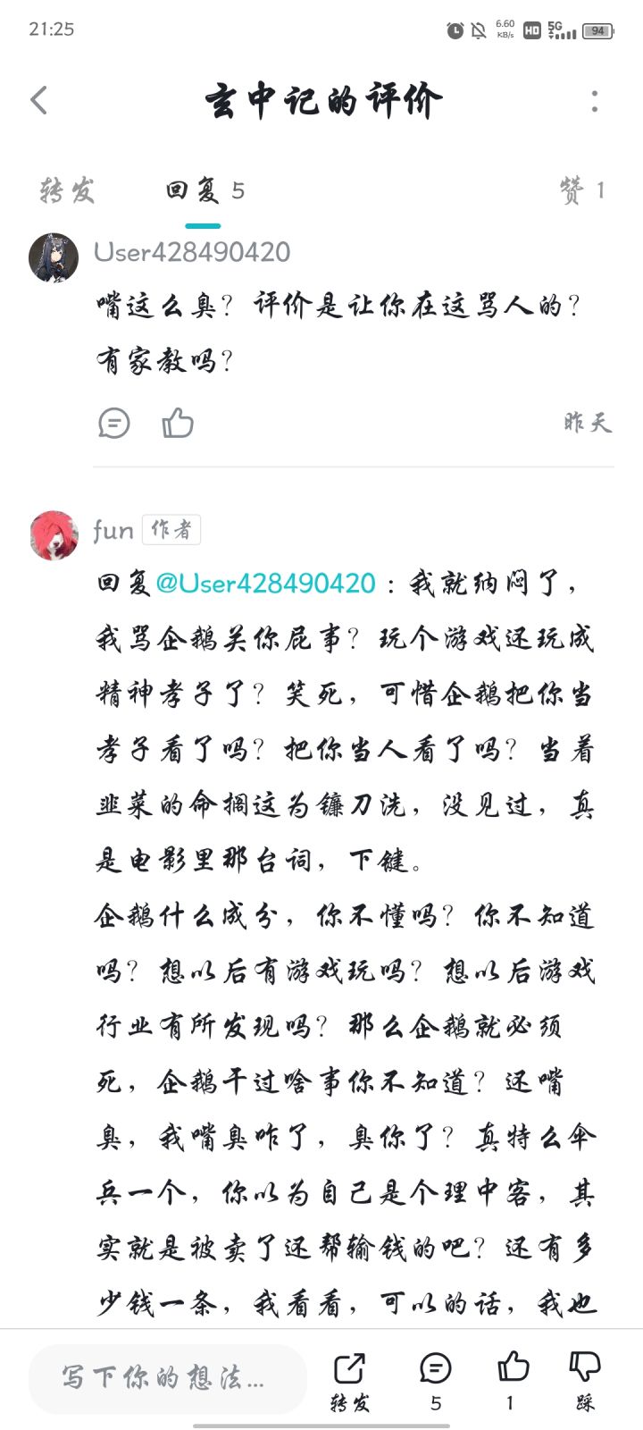 今天来挂一个精神孝,子啊,我骂企鹅,这b过来骂我,我给其他游戏指出不足,宣传画面与文字不符,这b来骂我,我就纳闷了,玩个游戏也能玩成孝子,,真是可笑,对线对不过还不让我回复了,呵呵