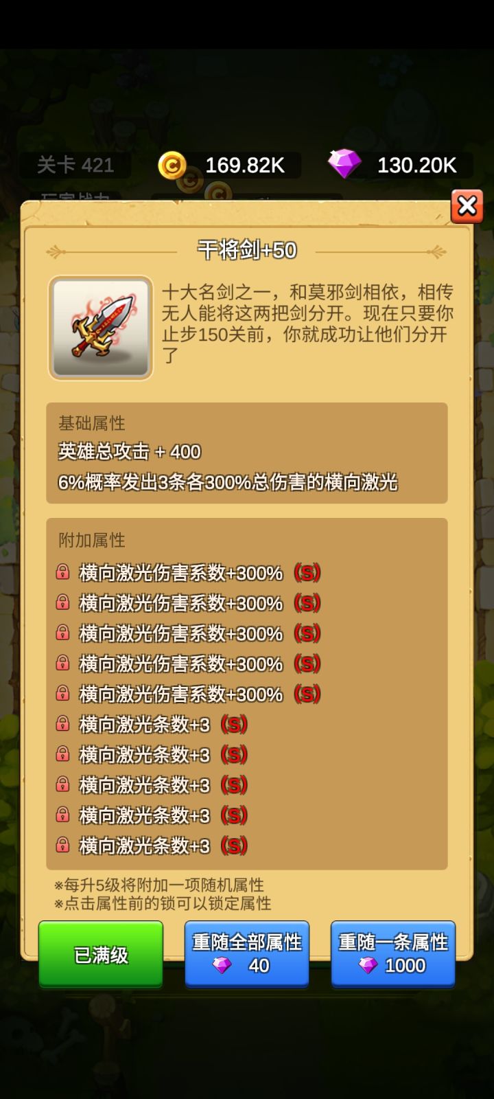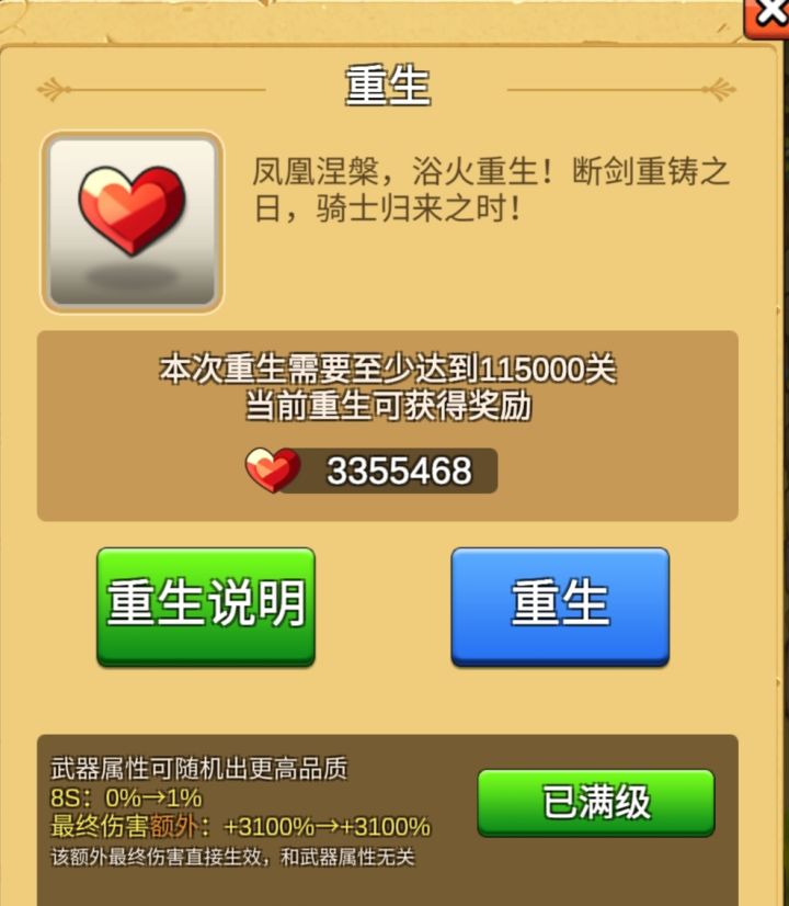 本攻略仅基于个人游戏体验总结,仅代表个人观点,如有不同意见请留言指出。信炮哥,秒刷出词条。玩游戏第一件事就是氪金。什么?没有氪金?嗯,没错,你现在玩的就是一款完全没有氪金的良心游戏。所有资源都靠你的拼搏和努力去获取:金币靠推图;钻石靠看广告;蓝钻靠打世界boss;重生点(爱心)靠重生。下面按四大核心资源点一一作阐述。一、金币及武器系统金币的唯一作用是升级武器。开局进入游戏即会获