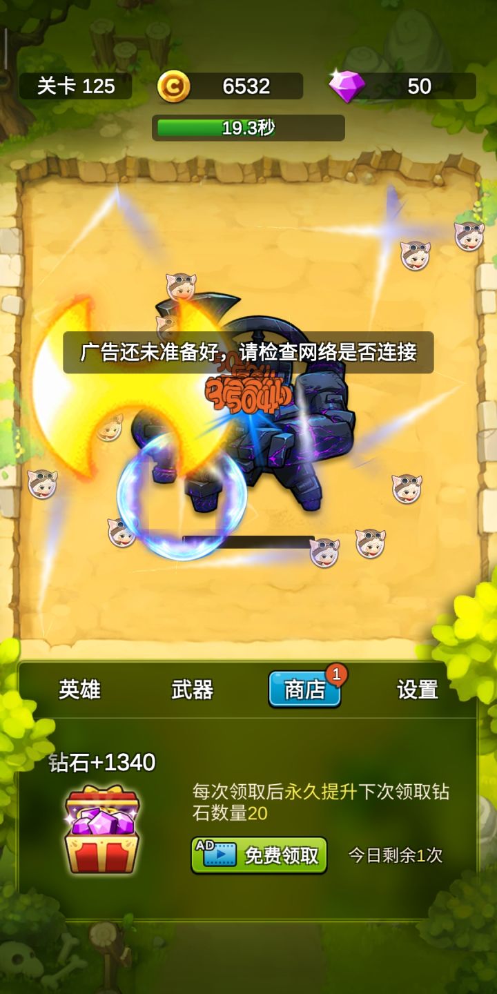 我第一次玩游戏这么想看广告的(因为钻石不够用了),但是广告一直显示在准备中,隔了好长一段时间不上线,也是看一个马上就又是准备中了
