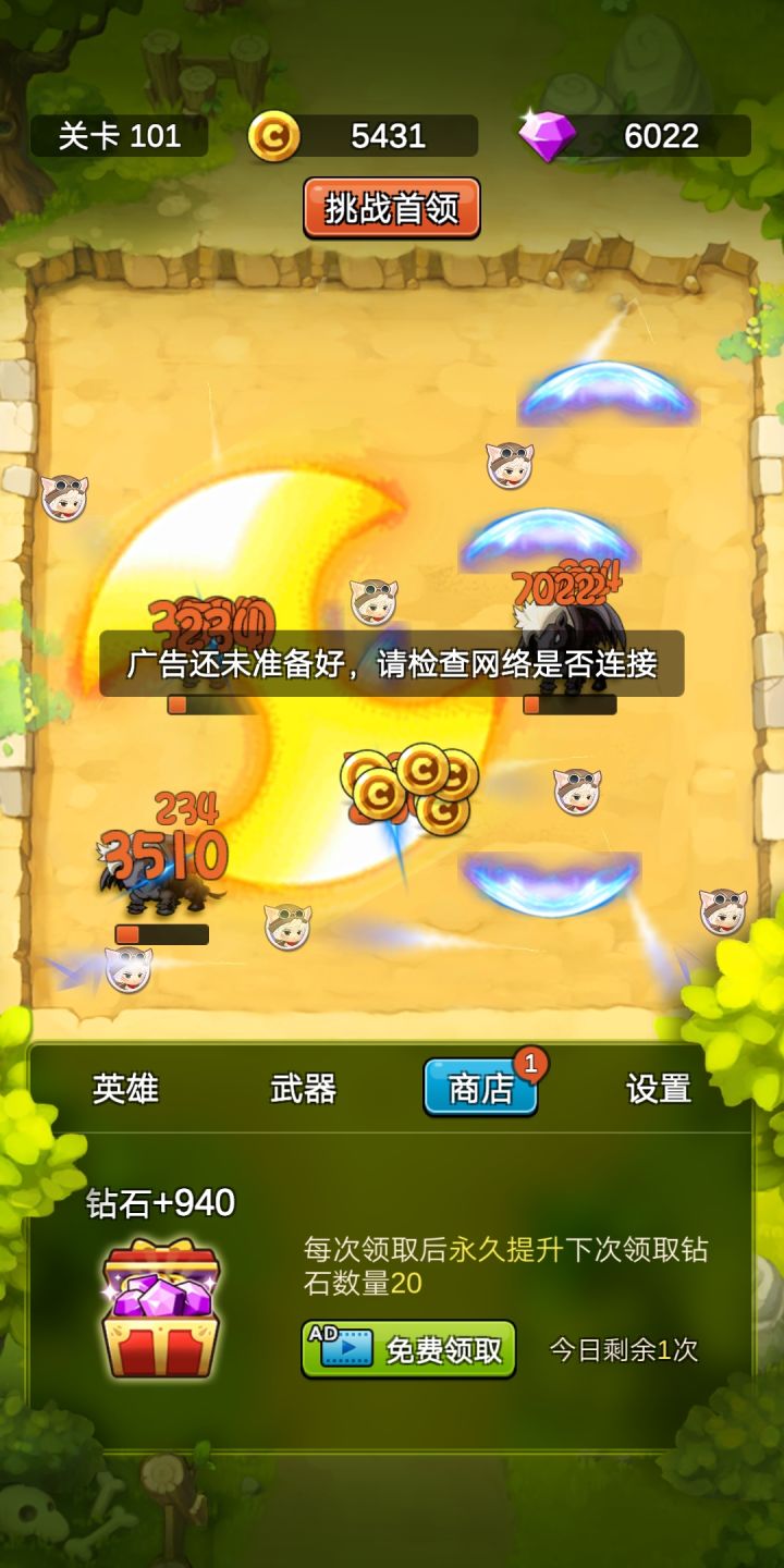 游戏本身的一个开始还是不错的 基于武器能刷新出加一个英雄的技能 比较bug 我觉得可以给挑战关的大哥们设定一些基础被动(大哥们是不能打人或者移动的原则上)比如碰击上概率性减速或者僵持 时间在2s到3s之间 后面甚至可以添加职业化 转职啊或者重生什么的 最好能做一个玩家面板明确当前属性也好观察游戏进度啊之类