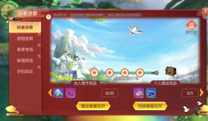 清明时节春光明媚、草木吐绿,正是人们春游的好时候。遍插柳枝,遥放纸鸢,在这个清明节里,蜀门手游更有惊喜踏青好礼相赠!【探春游景】活动时间:4月2日—4月6日活动内容:阳春三月,正是踏春赏花的好时候,活动期间,40级及以上玩家,每天赠送或收到春暖花开均会得到奖励~赠送他人春暖花开累计达到70个,总共可获得春游自选包*1、春游福袋*6、珍稀资源自选包*1、日常资源自选包*5等奖励。打开春游自