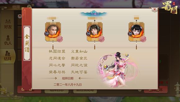 一个人闯荡江湖难免会寂寞所以结交一群好友结拜安全感+归属感瞬间up起来了有没有?!约好友来到关二爷面前干了这坛情谊酒友谊必会长长久久心情自然也是美美哒当你有了结拜队伍后头顶上就会出现象征性的结拜称号说起这个称号~需要想一个和自己团队人数相关的名字这就导致大家取名时需要打开脑洞(emmm)(45°仰望天空)我是绝对不会告诉你们我的结拜团队叫“一三得三”的!除了结拜称号有