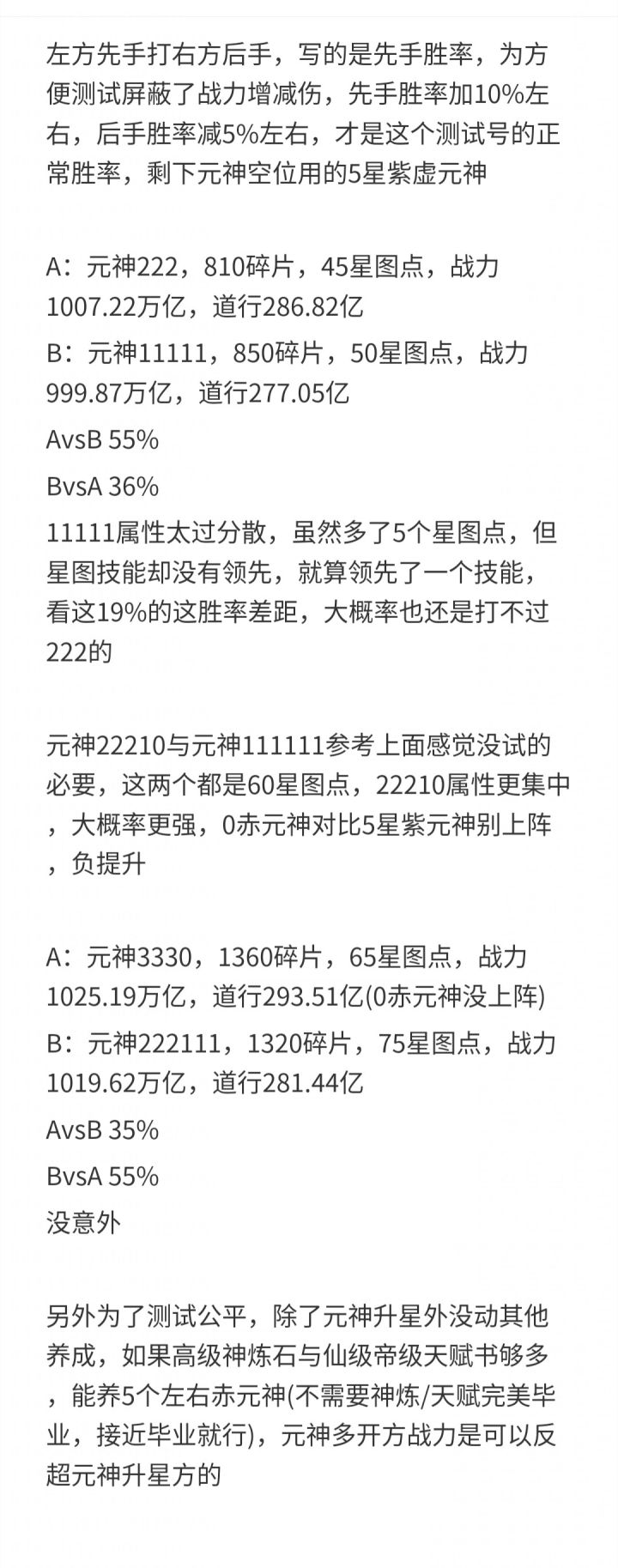 论坛里的元神攻略修改过了,可能还在审核中暂时看不到,直接写在这了补10碎片的白嫖与正常氪金的:111→222→一路2星开过去→222222→6个平均升不补碎片的白嫖:2→21→211→221→2211→2221→222111→6个平均升不补10碎片会在110卡一期活动才到111,而111有30星图点能刚好把最强质变技能点出来。数字代表星,111意思是开3个1星赤魇元神。