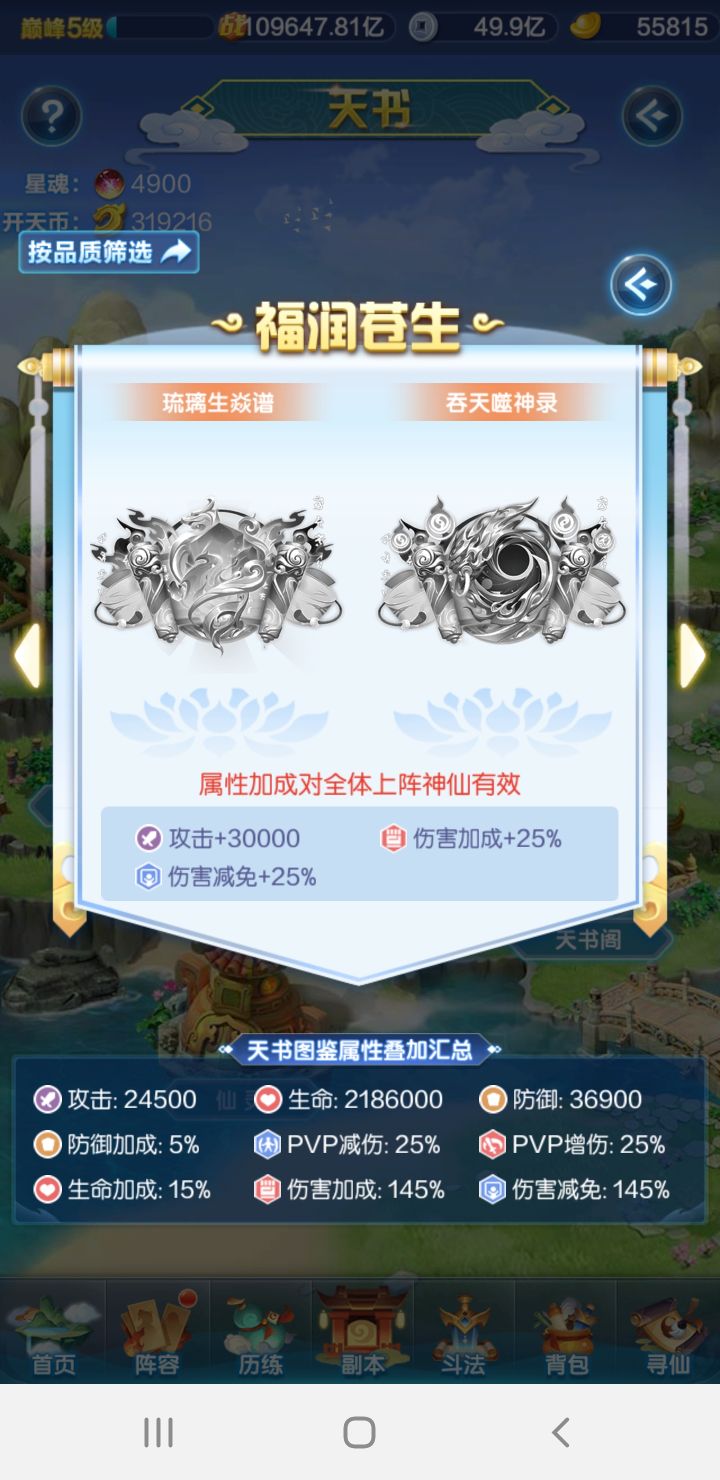 今天又是一大波提升,快11W亿了紫金书开了郧仙,还剩两本,天书商店快更新吧,我还想嫖幻彩书道符最后的太清开了,剩下就是慢慢升级了年底前应该还能嫖俩红法相出来,开图鉴