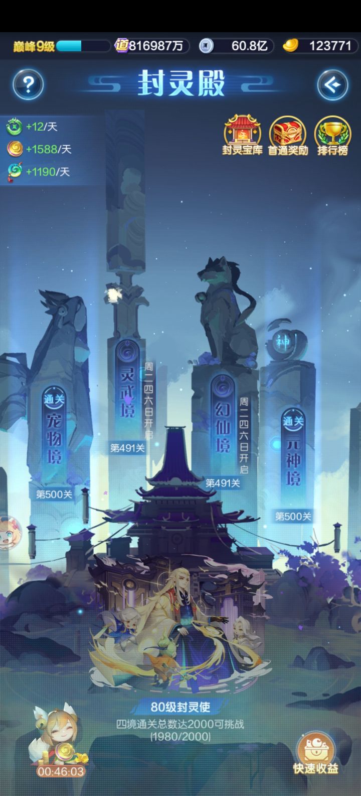 今天是出村第一天,刚好接上了主题二第一期活动的尾巴(元神)虽然遗憾不是神仙,但是元神也比宠物好吧(毕竟元神都有紫虚了,宠物还没有)。然后也是因为出村了,白嫖的我战力开始涨起来了。除了新手村内三期请仙,一期没中有些遗憾外,基本是完美开局了。关于庆典,今日就买了紫虚+青曜的元神,因为幻彩的我记得后期可以白嫖,就不想浪费元宝去买了其次是坠仙谷,说实在的,因为是白嫖,所以坠仙谷很难打,现在打到第六关