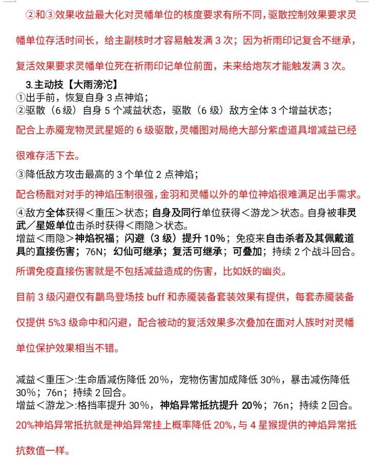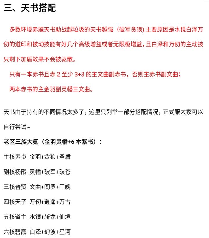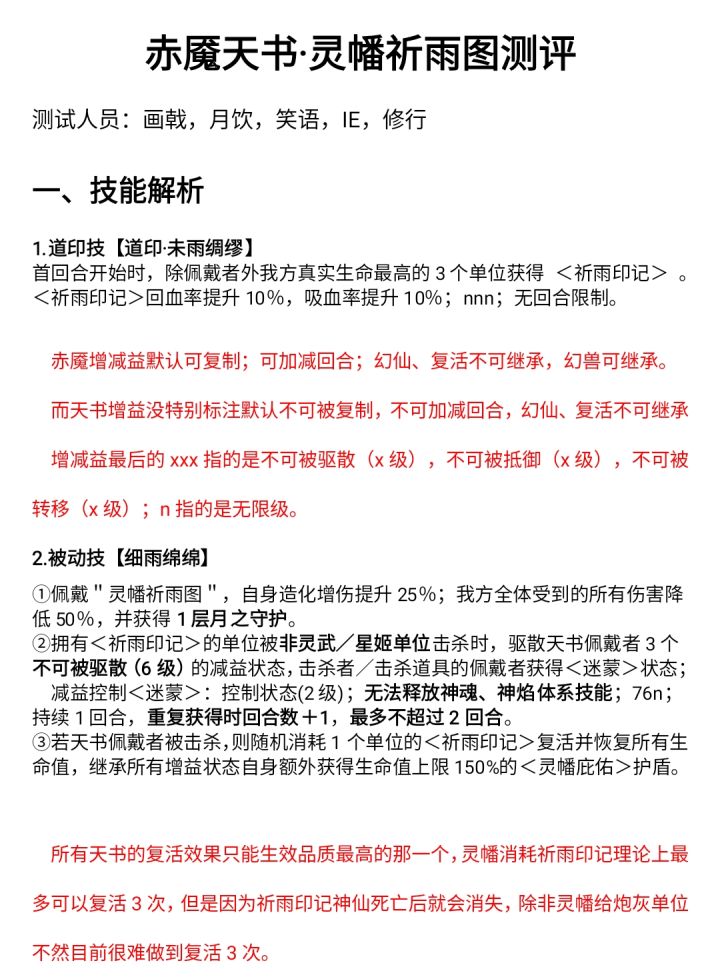 测试人员:班长、画戟、IE、惜缘、月饮山河一蓑落金羽,长廊自啸风。一、技能解析1、基础属性及基础技能 相较于紫虚天书,赤魇天书的基础属性和第1个基础技能提供的单体四维提高了67%,全体四维提高了100%,全体20%破挡/格挡保持不变,自身的10%至尊则变为了全体10%悟道,另外新增了5%的全体生命盾增伤。 第2个基础技能中,赤魇天书为佩戴者提供了85%的最终减伤和35%的最终增伤,相较紫