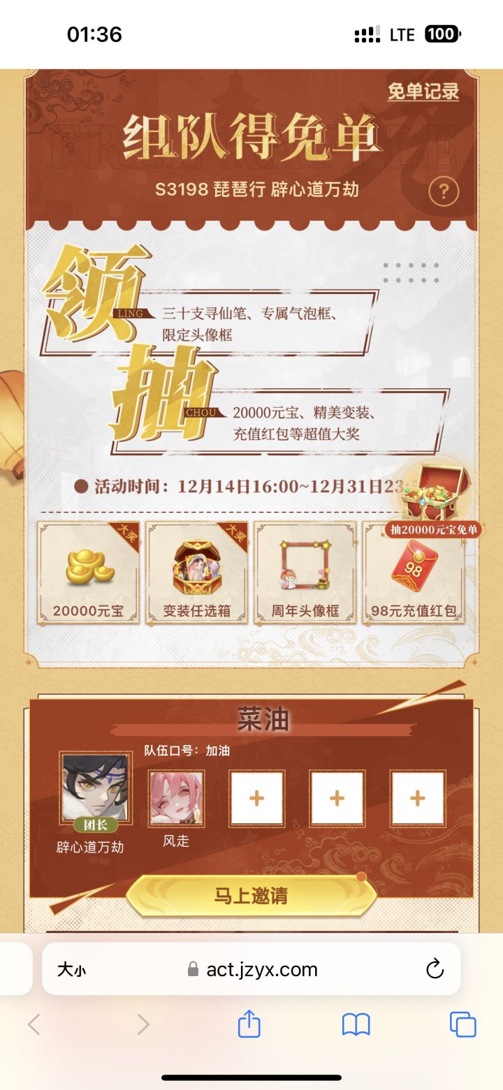 还有人嘛?复制加队邀请码【0594880】加入我的队伍【来来来随便】,一起抽20000元宝和变装任选箱免单!道友请留步八周年快乐!https://act.jzyx.com/dy/miandan/?id=0594880