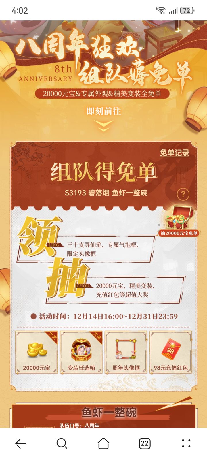 复制加队邀请码【0574047】加入我的队伍【鱼虾一整碗】,一起抽20000元宝和变装任选箱免单!道友请留步八周年快乐!https://act.jzyx.com/dy/miandan/?id=0574047