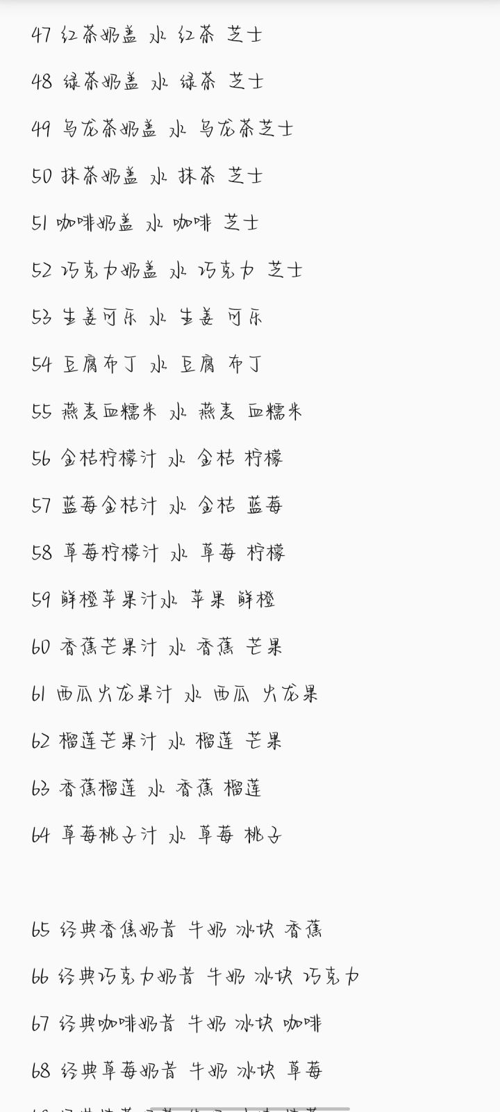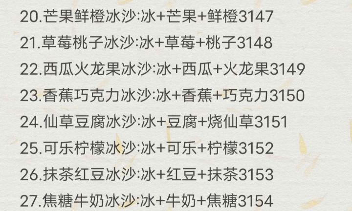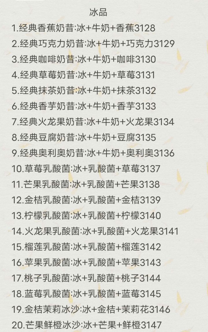 今天整理了一下制作需求的东西,就是说芝士和西米露真的太难刷到了😤还有部分因为材料刷不出来所以没有做但是看那个图鉴还是看得出来的,等有空再刷刷诶嘿😼————更新一下!所有都刷完啦!升二级的话就是所有材料×2,以此类推————老是忘记更新新品奶茶🤫材料:牛奶+西米露+木瓜