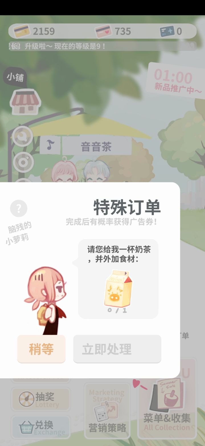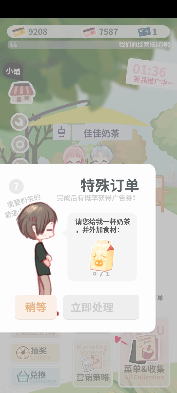 【建议】1.希望能加一个[招募客人]的功能,点击五次或者多少次可以找来一个已解锁客人。2.希望看一次广告能不能给两张券啊,一张的话要一直看广告,因为奶茶售价不高,赚钱超级慢,想要依靠抽奖获得多一点的食材太难了,孩子太可怜了。或者增加一个任务[看广告]看够多少次给几张券什么的,任务太少了。简而言之,只有一个问题,就是赚钱太慢了😂