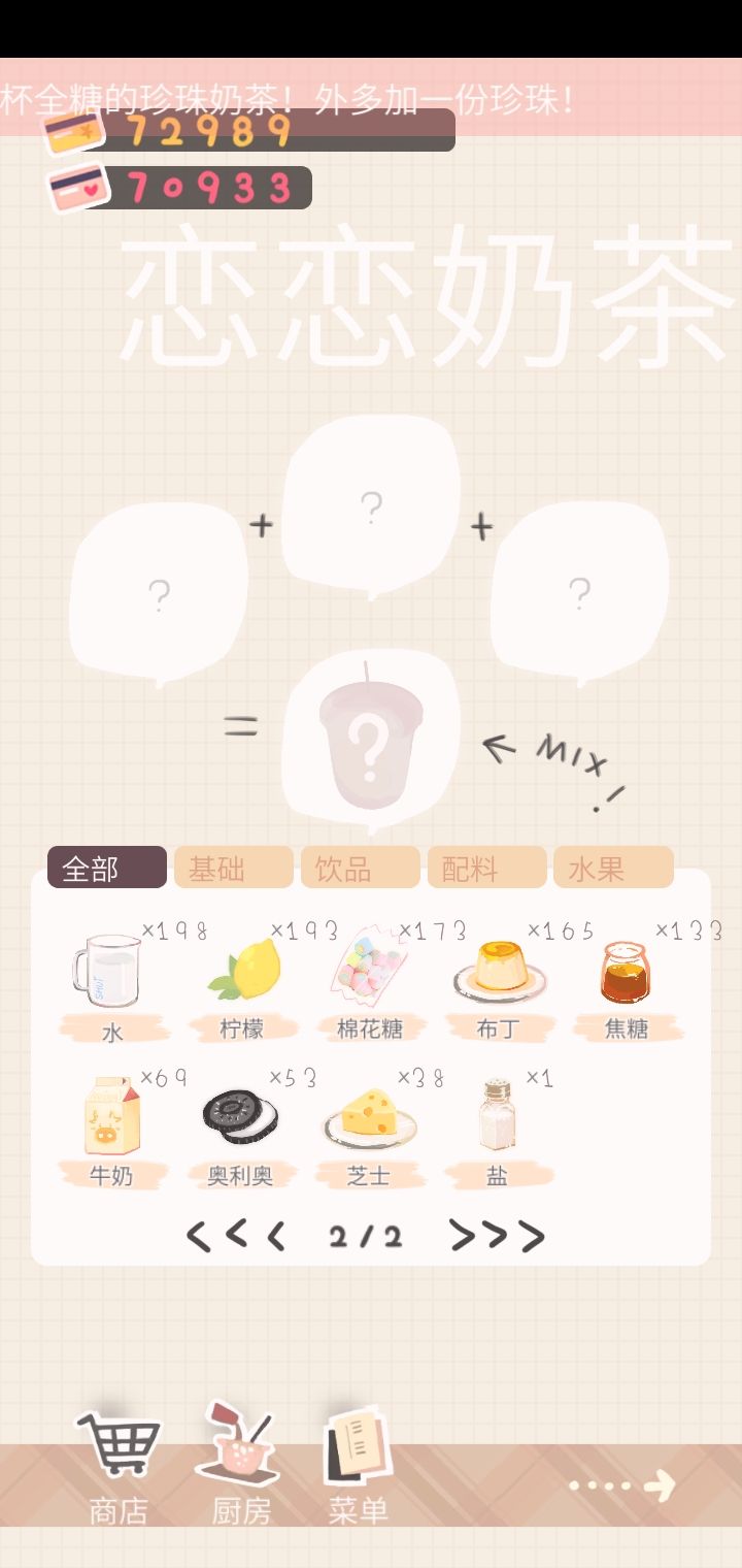终于解锁成功所有图标,但是对我这种收集癖来说食谱太少,太快就解锁完了,失去了继续玩下去的动力。另外想说金币抽食材,出茶叶的几率太高了吧,反而牛奶和水这种基础材料出现的数量反而比较少,后期奶茶升星好难,而且对我这种强迫症患者,储物柜里一波红茶绿茶难以消耗,看得我真的抓耳挠腮,好浪费啊!!!!