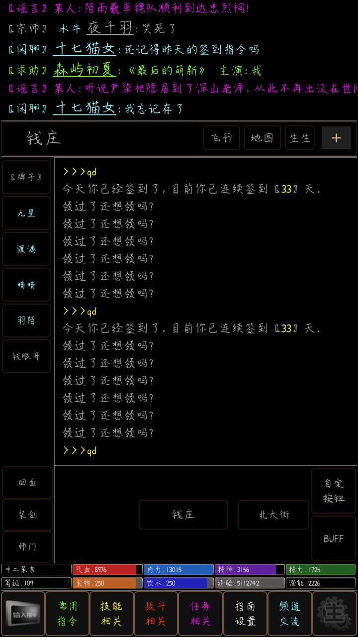 马上就要开学了,很多同学都要回到学校学习,那么我们就会落后很多,等放假回来的时候,你看别人都宗师了,你连门槛都没入,那怎么办呢?这个攻略可以解决你所有的问题!!!自动签到!点击左下角输入alias qd1 online -daysign;online -online 3;online -online 1;online -online 5;online -online 10再输入 alias
