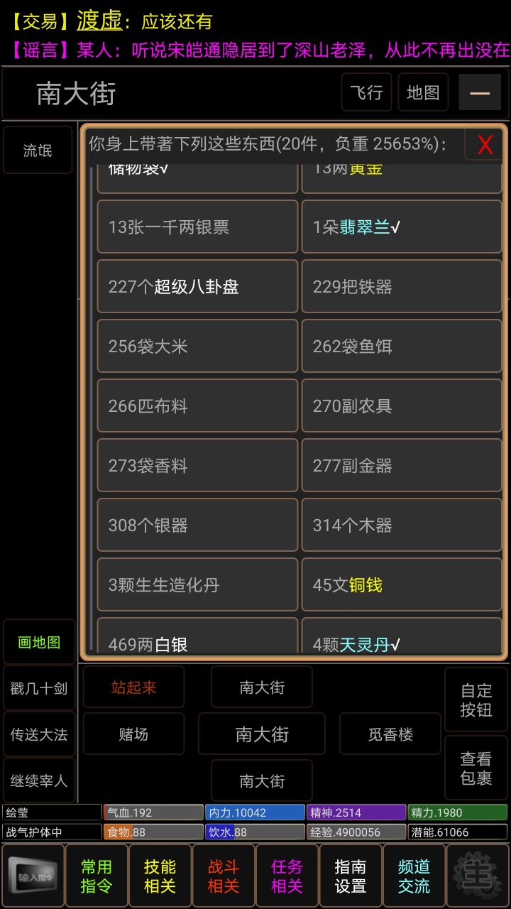 在这个游戏里,有很多阶段性的目标,而宗师,则是迈出新手村的门槛,在你得到游戏内四大npc宗师的认可后,你会得到大家的祝福,同时也真正的开始玩这个游戏了(聚义救命+1)宗师后,玩家可以去能睡觉的地方闭关(指令:closed),概率增加内力极限算法的加成系数,总成功加成次数为先天根骨数,随机增加200级以上武功和武修的经验,增加精力极限;玩家可以押镖,中品冲脉丹的主要获取途径,一天5次;潜能上限变为