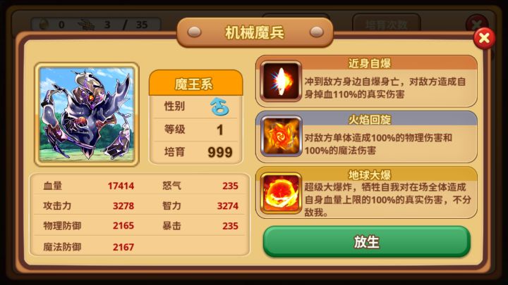 常听人说速升流与培育流,到底区别在哪里?实际上,速升流与培育流都是在提升怪物的属性面板,只不过走的途径不同,一个靠等级,一个靠培育。从这个炸弹人魔王的面板可以看到,游戏内怪物的属性主要有七维:血量、怒气、攻击力、智力、物理防御、暴击、魔法防御;这里不展开讲每个属性到底有什么用,相互之间到底怎么算,就单独讲讲等级和培育是如何影响面板属性的。