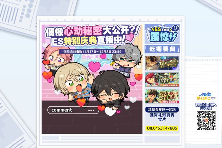 #偶像梦幻祭2# ES特别纪念庆典已开启,偶像们的心动要素究竟有哪些?这份爱意又能否传达给你?……戳https://es2.happyelements.cn,了解更多ES要闻趣事。