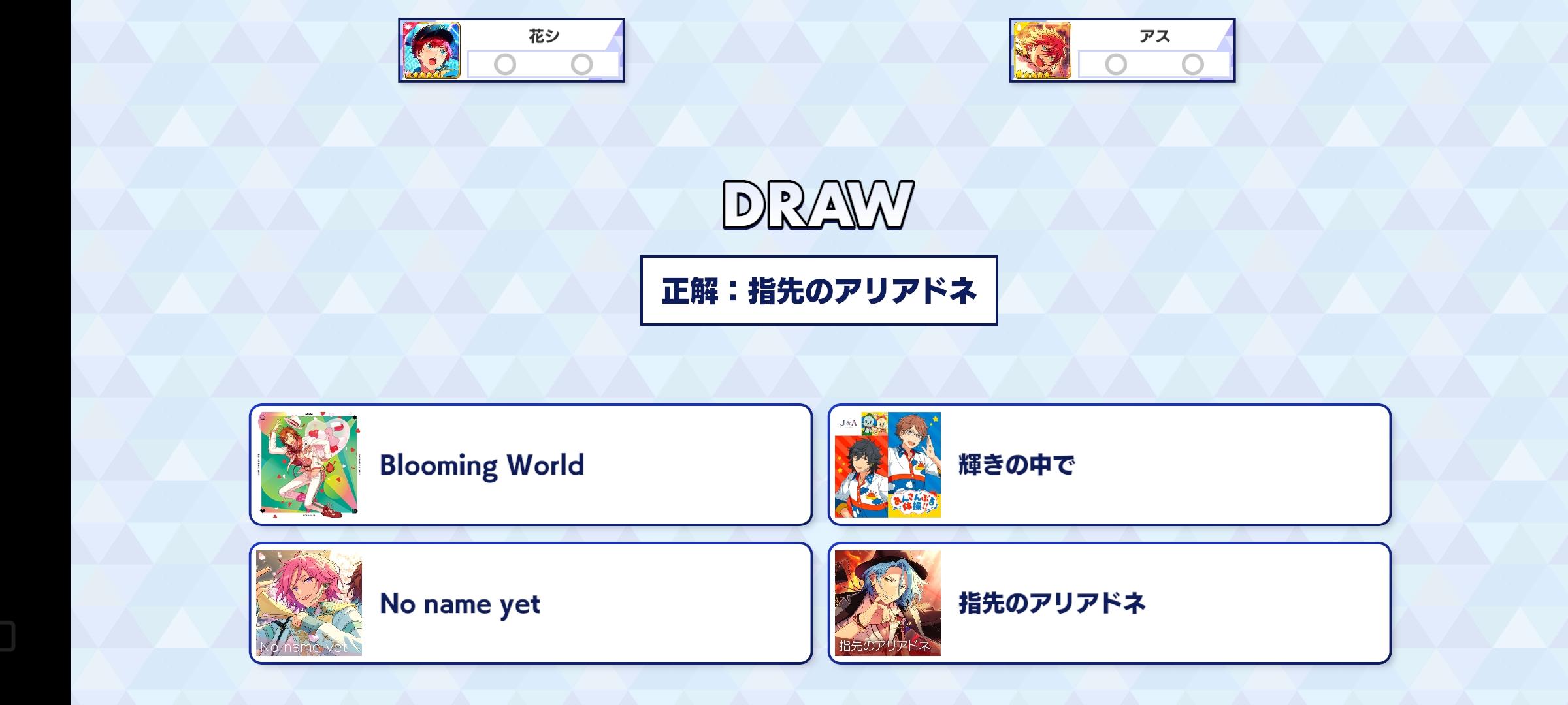 【求助】悄悄问一下,日服歌牌和好友打的那个板块没有办法计分,有人遇到过这种情况吗?是bug还是设置问题?会弹出正确答案的选项,但是选对了也不会计分,也没法停止游戏,我和好友都是这种情况,曲包也提前下载了。看不太懂日文,有大佬能指点一下吗(探头)
