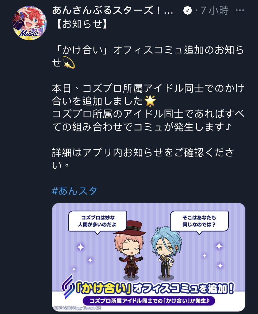 今天起追加CosPro事务所内组合间office对话!只要是cospro都成员之间都可以发生对话~详情请在游戏内确认