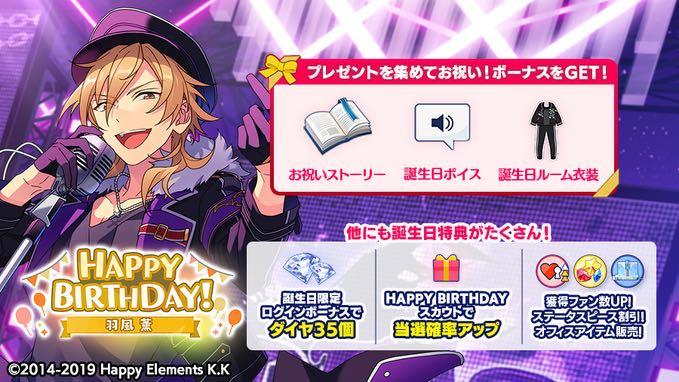 今天是🎊🎂 羽风 薰的生日!!🎂🎊将赠送35颗钻石💎作为登录礼物!可收集齐生日礼物🎁换取限定道具,还可获得其他生日特典音乐详细内容请在游戏内的告知里确认💫