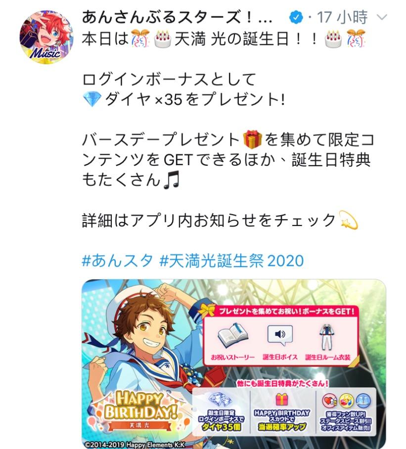 今天是 天满光 的生日!!将赠送35颗钻石作为登录礼物!可收集齐生日礼物换取限定道具,还可获得其他生日特典详细内容请在游戏内的告知里确认