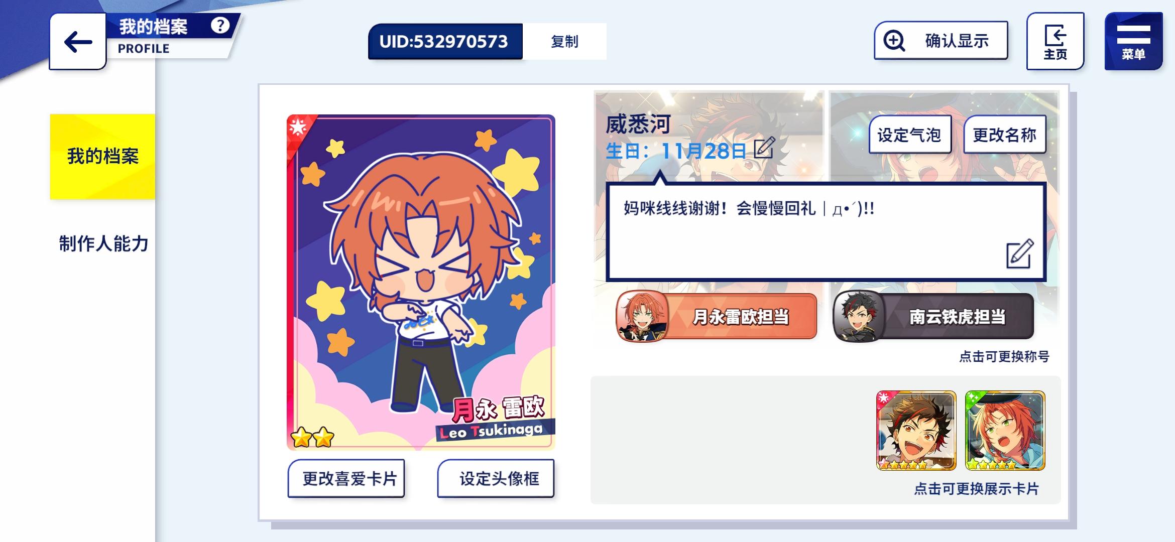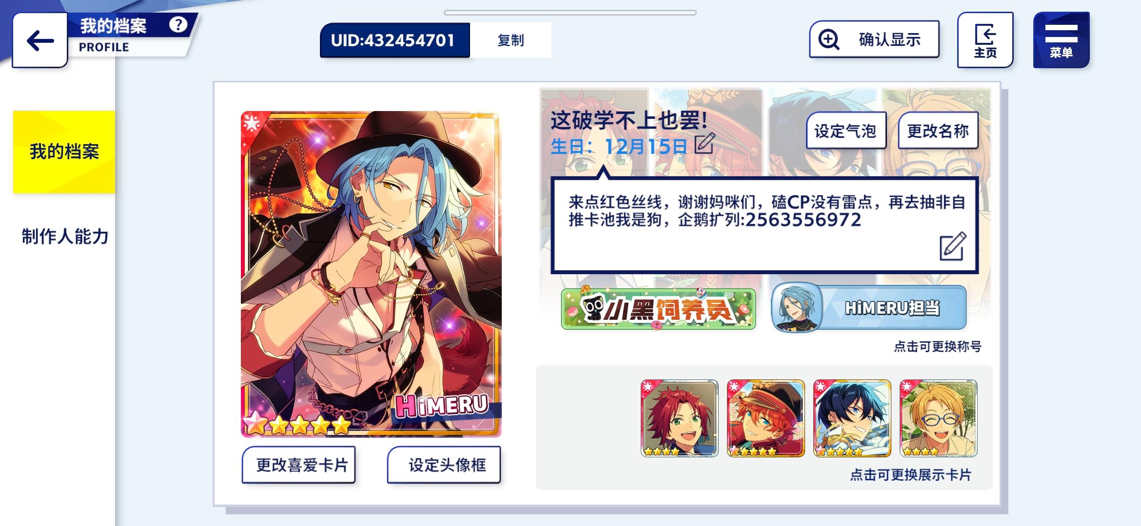 蹲一个后辈!随时都可以在线,耐心超级好,什么都不懂的萌新也可截图教!然后本人不吃cp,全员cb都可,所以不用怕踩雷,可愉快聊天(*^ω^*)QQ:835261714【推荐加这个】UID:420748333