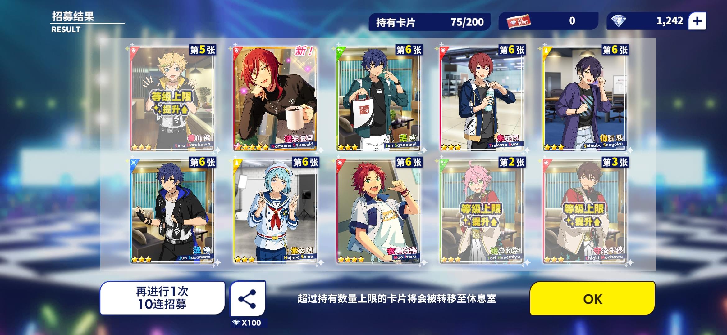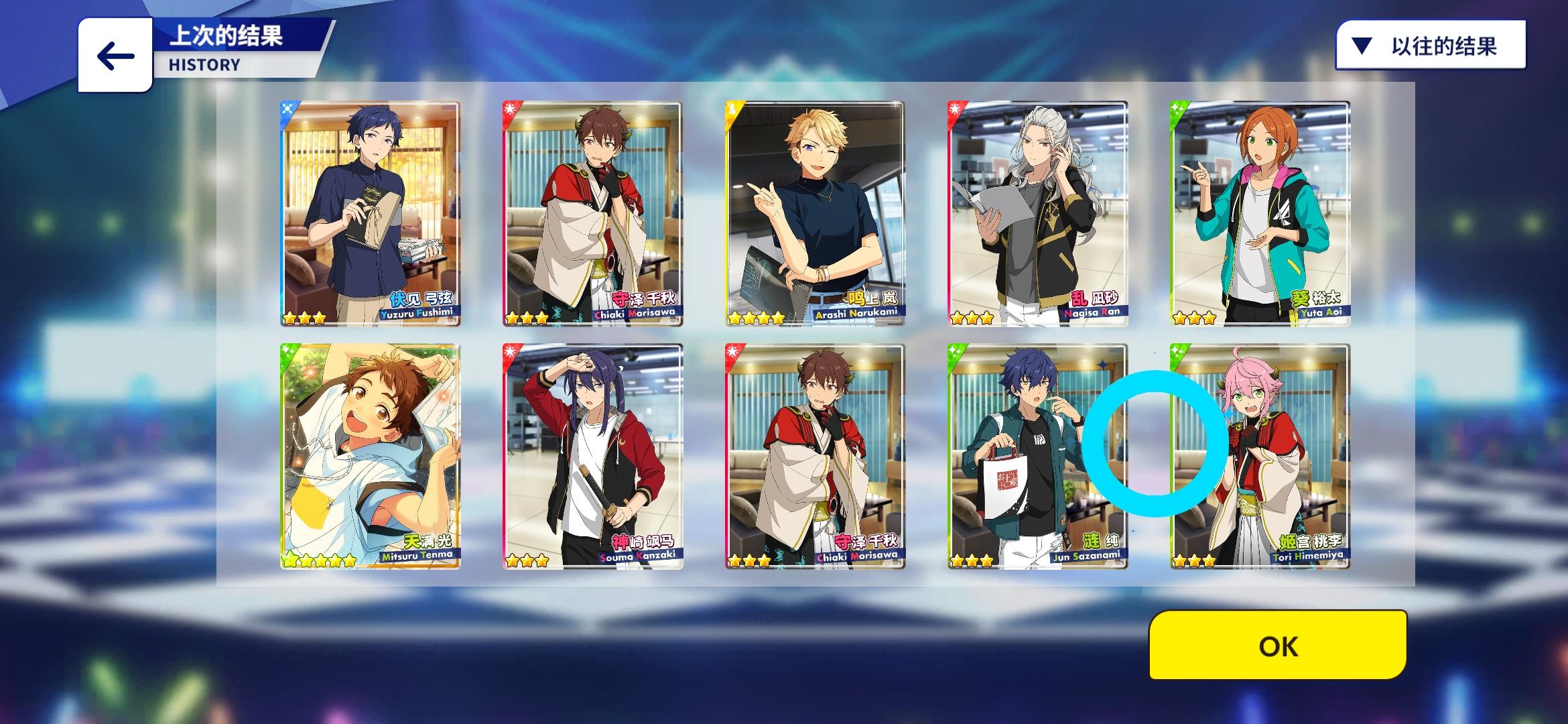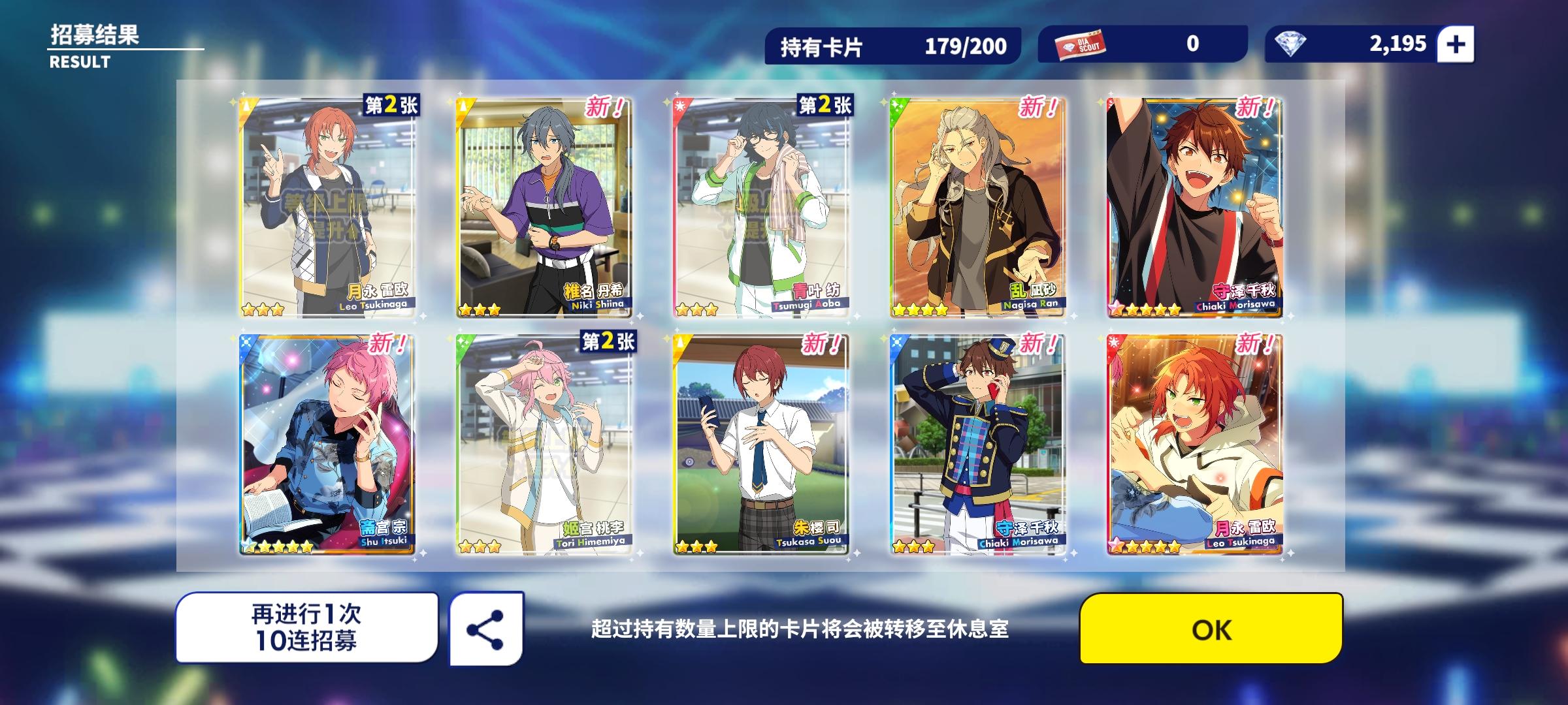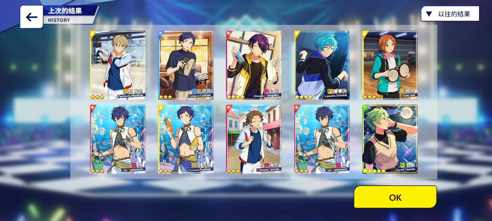 全歪了但还是很高兴原本只打算来两个黄光就收手,结果第二个十连突然出彩,是没有五星的天满光!非常高兴心思再来一下吧!又出彩!又歪出了没有五星的逆先夏目!歪新的其实就很开心。。。目前我还差衣更真绪,仙石忍,鸣上岚,影片美伽就可以变身幸福的全员五星人!开心!