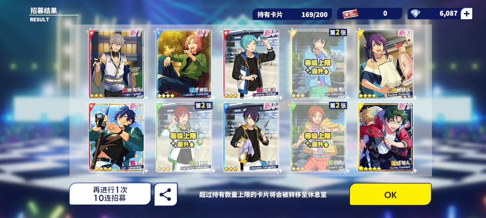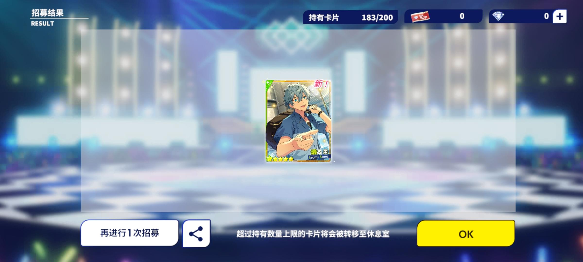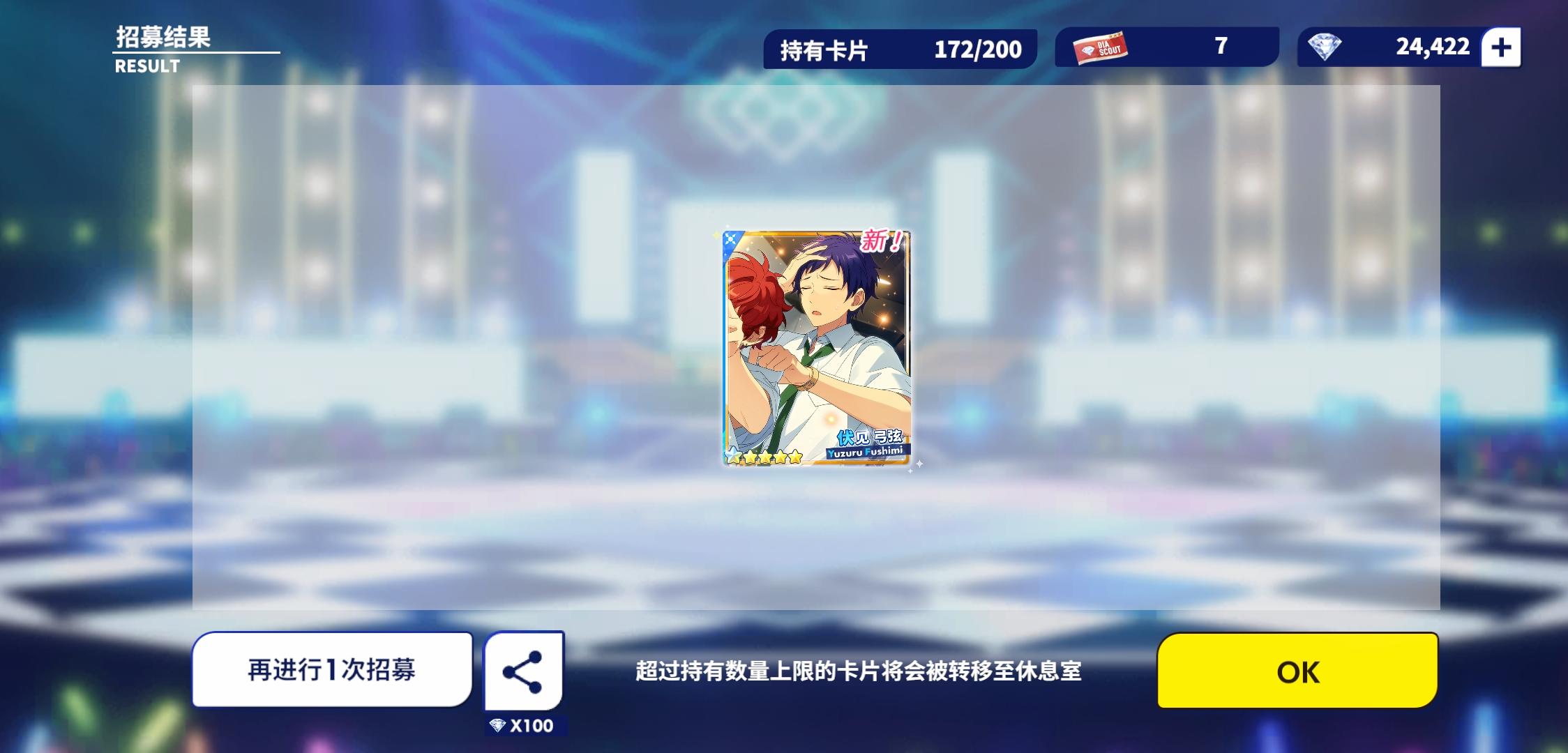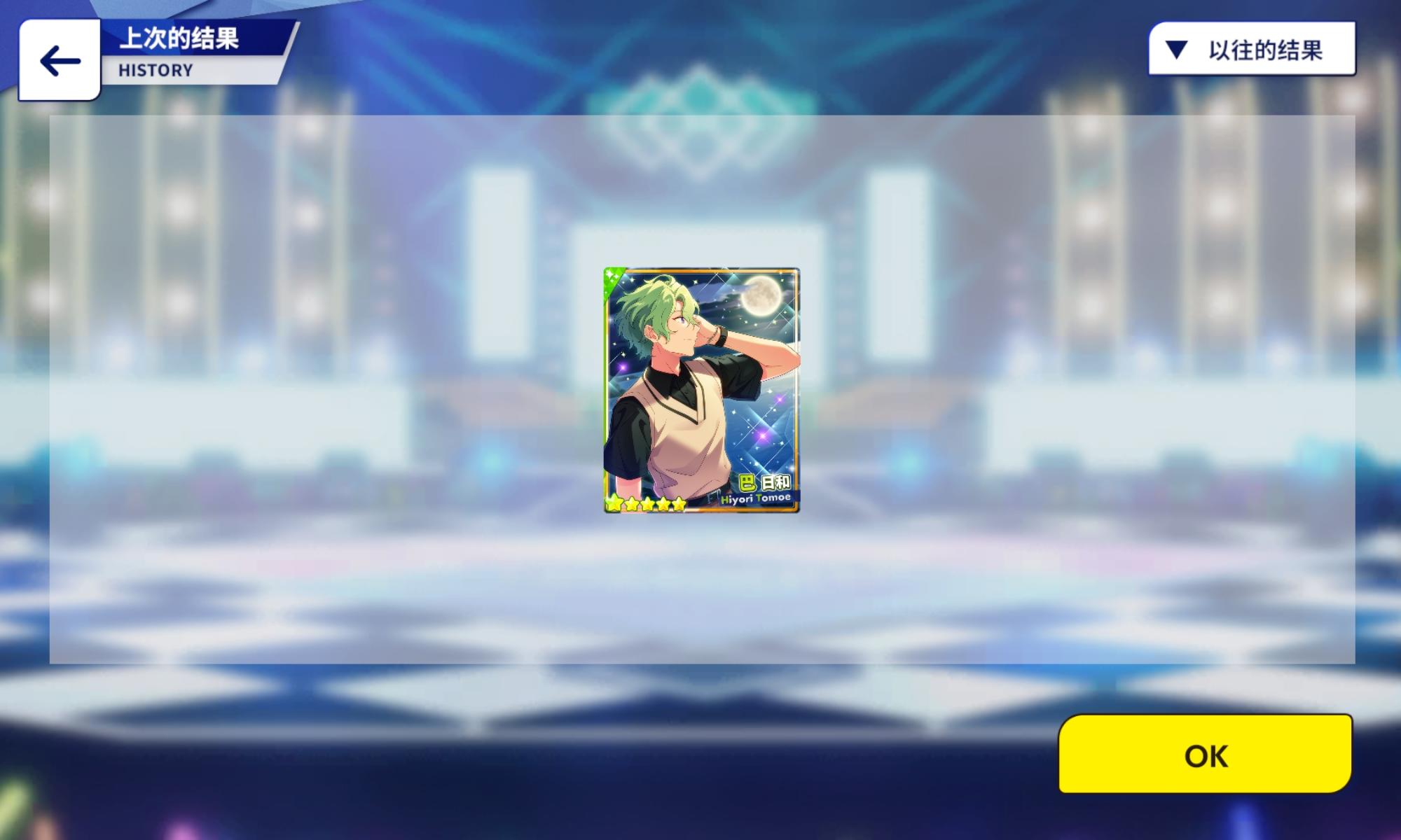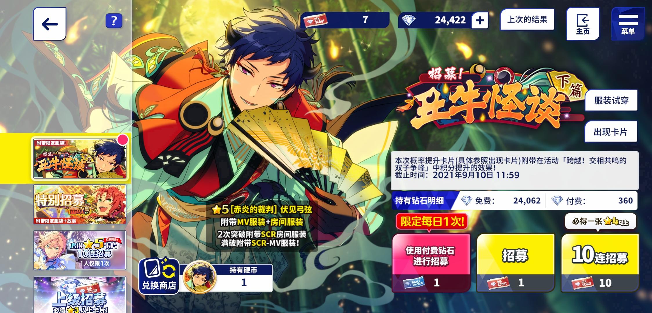全歪了但还是很高兴原本只打算来两个黄光就收手,结果第二个十连突然出彩,是没有五星的天满光!非常高兴心思再来一下吧!又出彩!又歪出了没有五星的逆先夏目!歪新的其实就很开心。。。目前我还差衣更真绪,仙石忍,鸣上岚,影片美伽就可以变身幸福的全员五星人!开心!